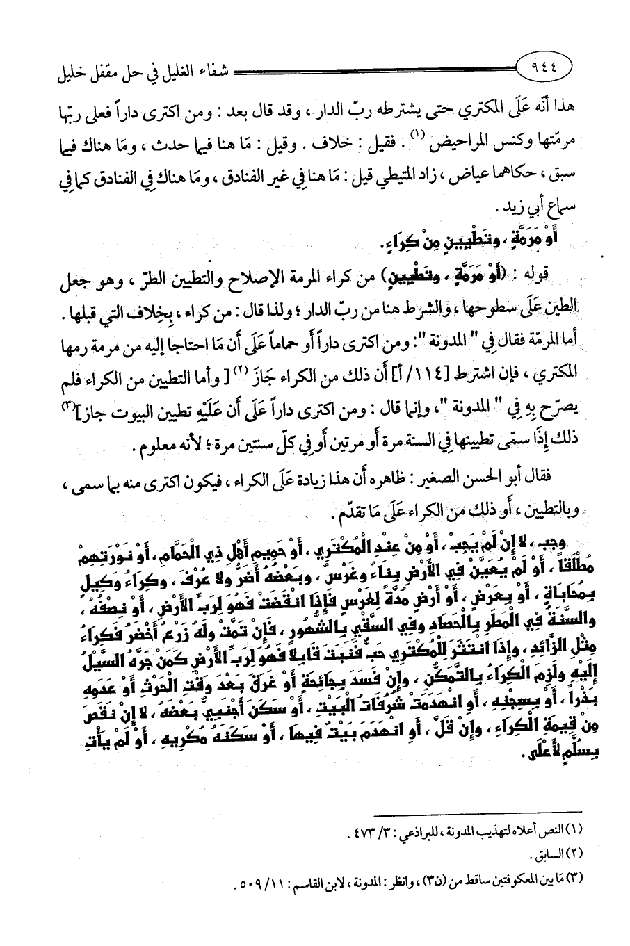قوله: (أَوْ مَرَمَّةٍ، وتَطْيِينٍ) من كراء المرمة الإصلاح والتطيين الطرّ، وهو جعل الطين عَلَى سطوحها، والشرط هنا من ربّ الدار؛ ولذا قال: من كراء، بِخِلاف التي قبلها. أما المرمّة فقال فِي " المدونة ": ومن اكترى داراً أَو حماماً عَلَى أَن مَا احتاجا إليه من مرمة رمها المكتري، فإن اشترط [114 / أ] أَن ذلك من الكراء جَازَ (¬2) [وأما التطيين من الكراء فلم يصرّح بِهِ فِي " المدونة "، وإنما قال: ومن اكترى داراً عَلَى أَن عَلَيْهِ تطيين البيوت جاز] (¬3) ذلك إِذَا سمّى تطيينها فِي السنة مرة أَو مرتين أَو فِي كلّ سنتين مرة؛ لأنه معلوم.