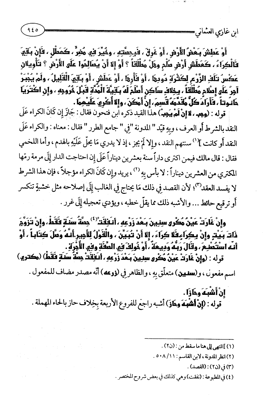 قوله: (وجب، لا إِنْ لَمْ يَجِبْ) هذا القيد ذكره ابن فتحون فقال: جَازَ إِن كَانَ الكراء عَلَى النقد بالشرط أَو العرف، وبِهِ قيّد " المدونة " فِي " جامع الطرر " فقال: معناه: والكراء عَلَى النقد أَو كانت] (¬1) سنتهم النقد، وإِلا لَمْ يجز، إذ لا يدري مَا يحلّ عَلَيْهِ بالهدم، وأما اللخمي فقال: قال مالك فيمن اكترى داراً سنة بعشرين ديناراً عَلَى إِن احتاجت الدار إِلَى مرمة رمّها المكتري من العشرين ديناراً: لا بأس بِهِ (¬2)، يريد وإِن كَانَ الكراء مؤجلاً، فإن هذا الشرط لا يفسد العقد (¬3)؛ لأن القصد فِي ذلك مَا يحتاج فِي الغالب إِلَى إصلاحه مثل خشبةٍ تنكسر أَو ترقيع حائط ... والأشبه ذلك مما يقلّ خطبه، ويؤدي تعجيله إِلَى غرر.