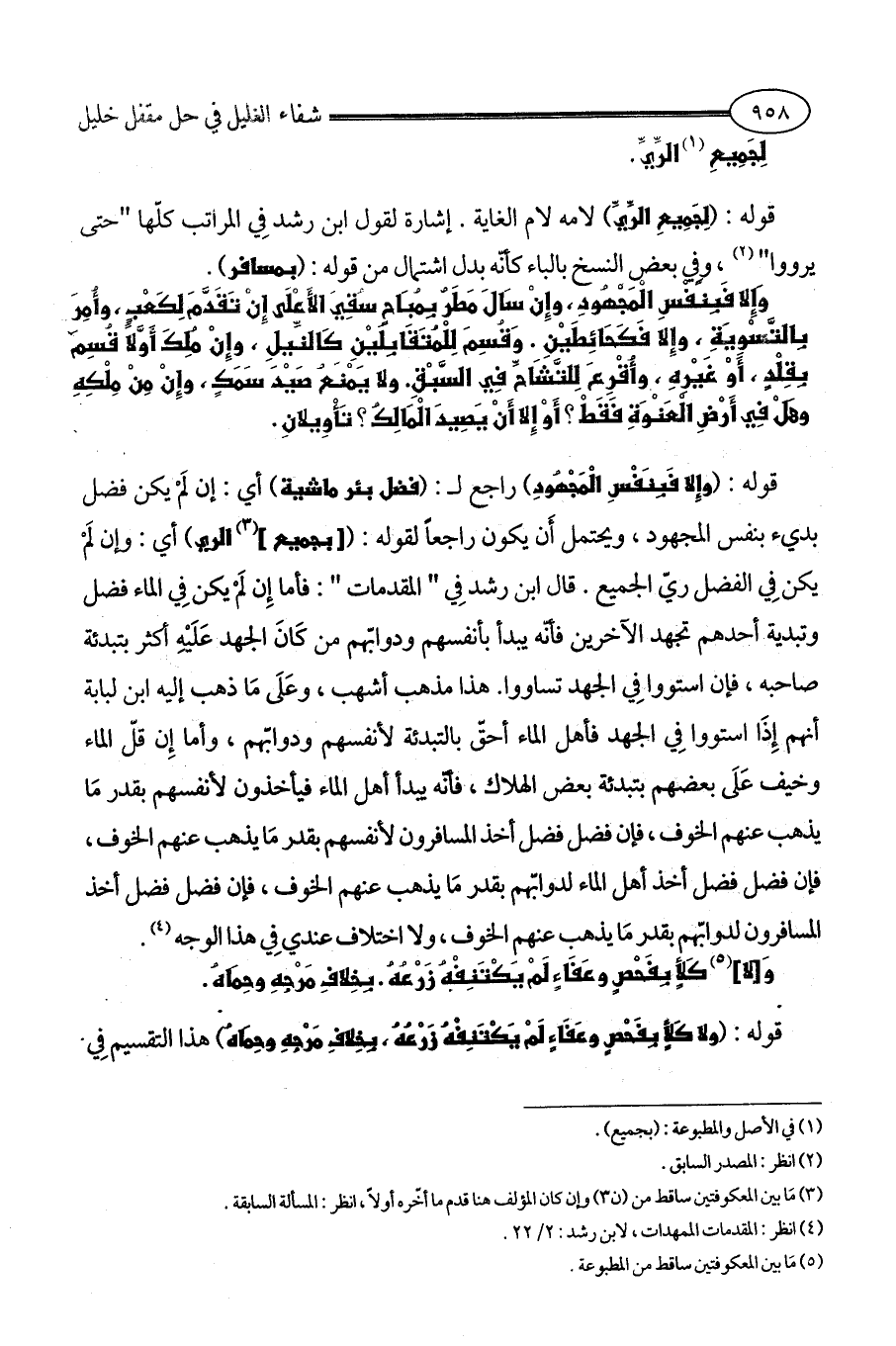 قوله: (لِجَمِيعِ الرِّيِّ) لامه لام الغاية. إشارة لقول ابن رشد فِي المراتب كلّها " حتى يرووا " (¬2)، وفِي بعض النسخ بالباء كأنّه بدل اشتمال من قوله: (بمسافر).