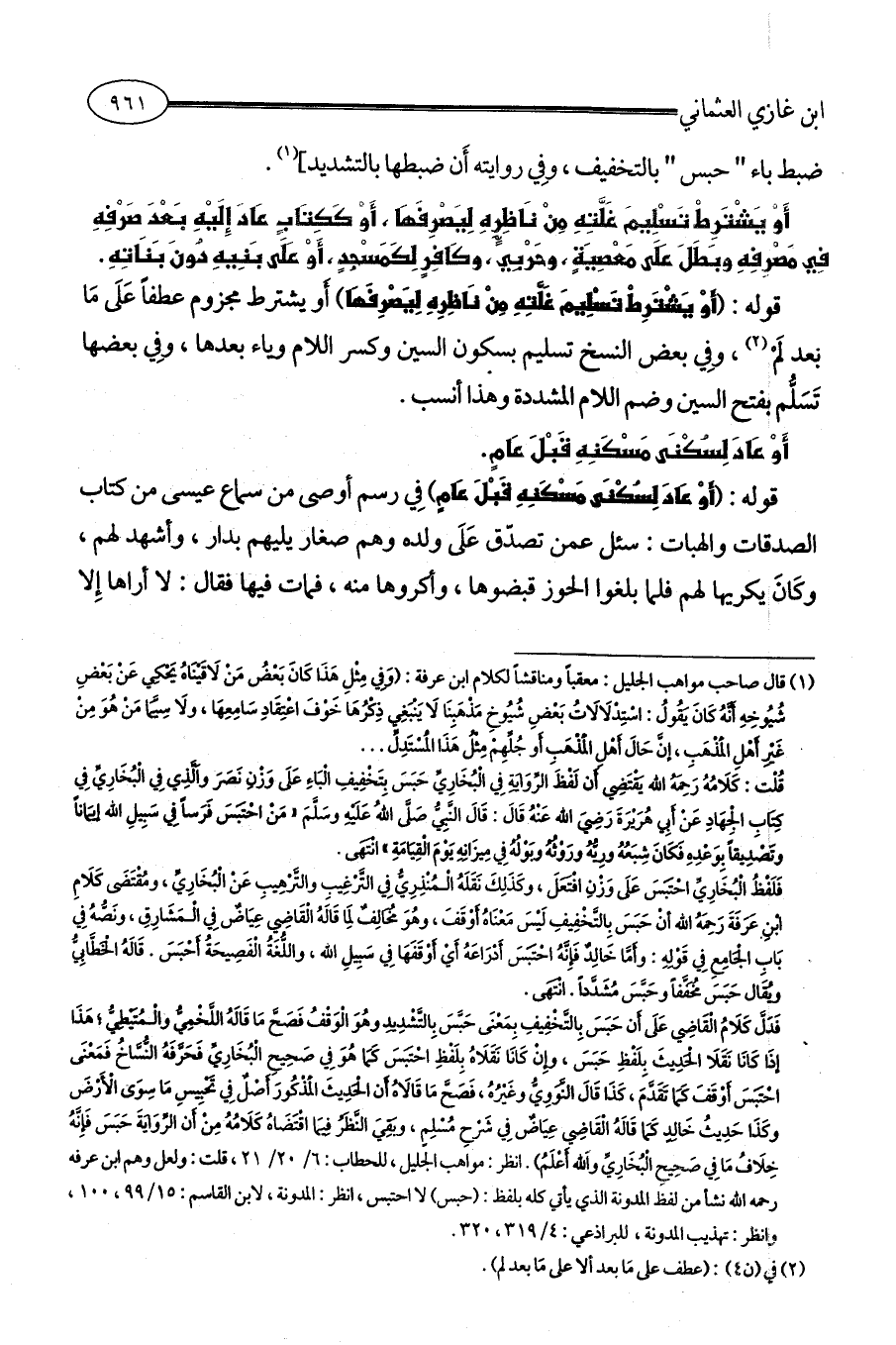فَدَلَّ كَلَامُ الْقَاضِي عَلَى أَن حَبَسَ بِالتَّخْفِيفِ بِمَعْنَى حَبَّسَ بِالتَّشْدِيدِ وهُوَ الْوَقْفُ فَصَحَّ مَا قَالَهُ اللَّخْمِيُّ والْمُتَيْطِيُّ؛ هَذَا إذَا كَانَا نَقَلَا الْحَدِيثَ بِلَفْظِ حَبَسَ، وإِنْ كَانَا نَقَلَاهُ بِلَفْظِ احْتَبَسَ كَمَا هُوَ فِي صَحِيحِ الْبُخَارِيِّ فَحَرَّفَهُ النُّسَّاخُ فَمَعْنَى احْتَبَسَ أَوْقَفَ كَمَا تَقَدَّمَ، كَذَا قَالَ النَّوَوِيُّ وغَيْرُهُ، فَصَحَّ مَا قَالَاهُ أَن الْحَدِيثَ الْمَذْكُورَ أَصْلٌ فِي تَحْبِيسِ مَا سِوَى الْأَرْضَ وكَذَا حَدِيثُ خَالِدٍ كَمَا قَالَهُ الْقَاضِي عِيَاضٌ فِي شَرْحِ مُسْلِمٍ، وبَقِيَ النَّظَرُ فِيمَا اقْتَضَاهُ كَلَامُهُ مِنْ أَن الرِّوَايَةَ حَبَسَ فَإِنَّهُ خِلَافُ مَا فِي صَحِيحِ الْبُخَارِيِّ واَلله أَعْلَمُ). انظر: مواهب الجليل، للحطاب: 6/ 20 / 21، قلت: ولعل وهم ابن عرفه رحمه الله نشأ من لفظ المدونة الذي يأتي كله بلفظ: (حبس) لا احتبس، انظر: المدونة، لابن القاسم: 15/ 99، 100، وانظر: تهذيب المدونة، للبراذعي: 4/ 319، 320.