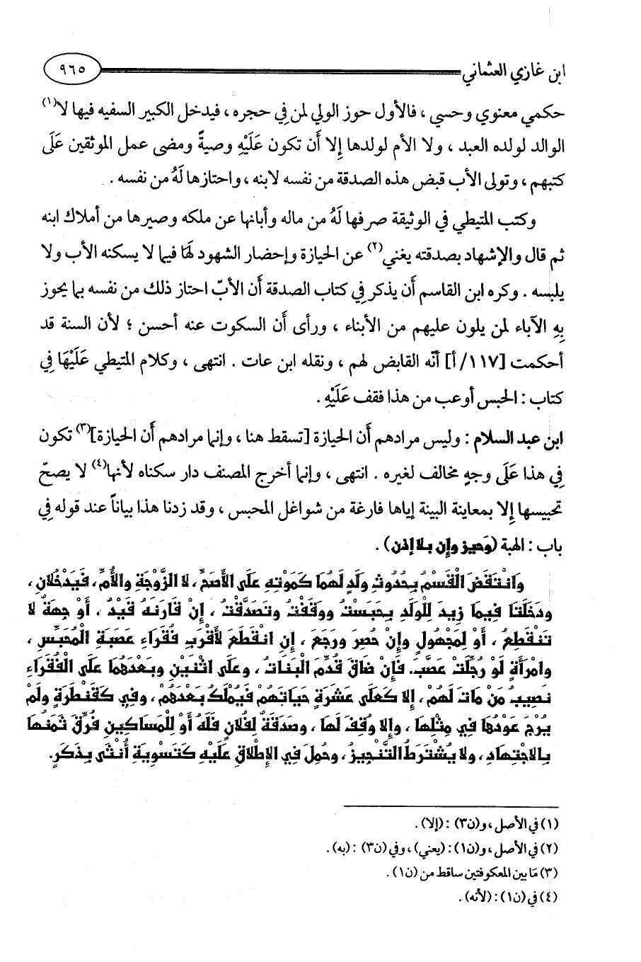 ابن عبد السلام: وليس مرادهم أَن الحيازة [تسقط هنا، وإنما مرادهم أَن الحيازة] (¬3) تكون فِي هذا عَلَى وجهٍ مخالف لغيره. انتهى، وإنما أخرج المصنف دار سكناه لأنها (¬4) لا يصحّ تحبيسها إِلا بمعاينة البينة إياها فارغة من شواغل المحبس، وقد زدنا هذا بياناً عند قوله فِي باب: الهبة (وَحيز وإِن بلا إذن).