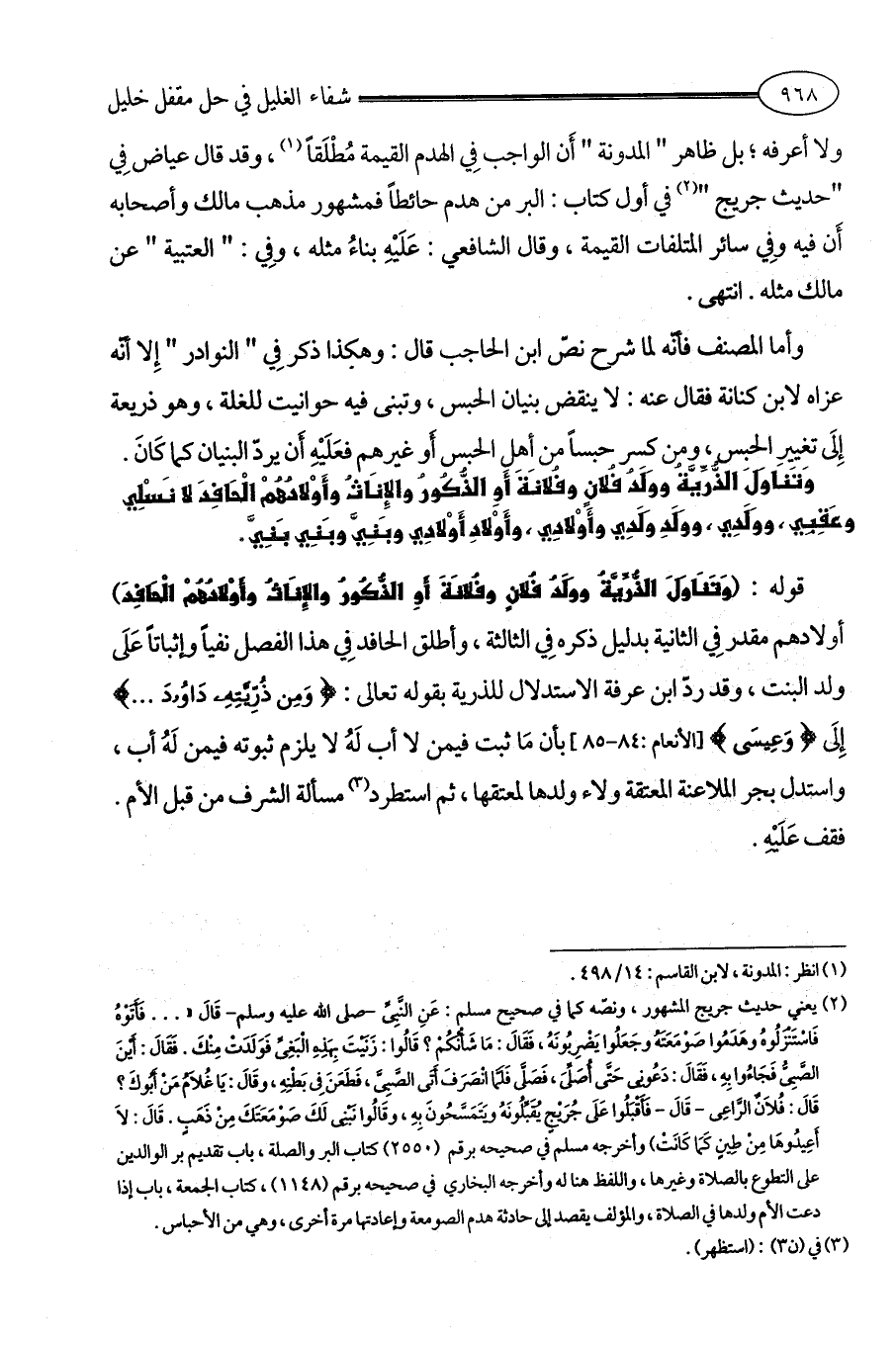 (¬2) يعني حديث جريج المشهور، ونصّه كما في صحيح مسلم: عَنِ النَّبِىِّ -صلى الله عليه وسلم- قَالَ ". . . فَأَتَوْهُ فَاسْتَنْزَلُوهُ وهَدَمُوا صَوْمَعَتَهُ وجَعَلُوا يَضْرِبُونَهُ، فَقَالَ: مَا شَأْنُكُمْ؟ قَالُوا: زَنَيْتَ بِهَذِهِ الْبَغِىِّ فَوَلَدَتْ مِنْكَ. فَقَالَ: أَيْنَ الصَّبِىُّ فَجَاءُوا بِهِ، فَقَالَ: دَعُونِى حَتَّى أُصَلِّىَ، فَصَلَّى فَلَمَّا انْصَرَفَ أَتَى الصَّبِىَّ، فَطَعَنَ فِى بَطْنِهِ، وقَالَ: يَا غُلاَمُ مَنْ أَبُوكَ؟ قَالَ: فُلاَنٌ الرَّاعِى - قَالَ - فَأَقْبَلُوا عَلَى جُرَيْجٍ يُقَبِّلُونَهُ ويَتَمَسَّحُونَ بِهِ، وقَالُوا نَبْنِى لَكَ صَوْمَعَتَكَ مِنْ ذَهَبٍ. قَالَ: لاَ أَعِيدُوهَا مِنْ طِينٍ كَمَا كَانَتْ) وأخرجه مسلم في صحيحه برقم (2550) كتاب البر والصلة، باب تقديم بر الوالدين على التطوع بالصلاة وغيرها، واللفظ هنا له وأخرجه البخاري في صحيحه برقم (1148)، كتاب الجمعة، باب إذا دعت الأم ولدها في الصلاة، والمؤلف يقصد إلى حادثة هدم الصومعة وإعادتها مرة أخرى، وهي من الأحباس.