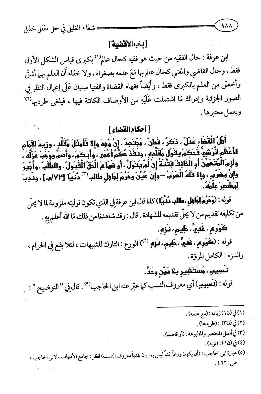 (¬5) عبارة ابن الحاجب: (أن يكون ورعاً غنياً ليس بمديان بلدياً معروف النسب) انظر: جامع الأمهات، لابن الحاجب، ص: 462.