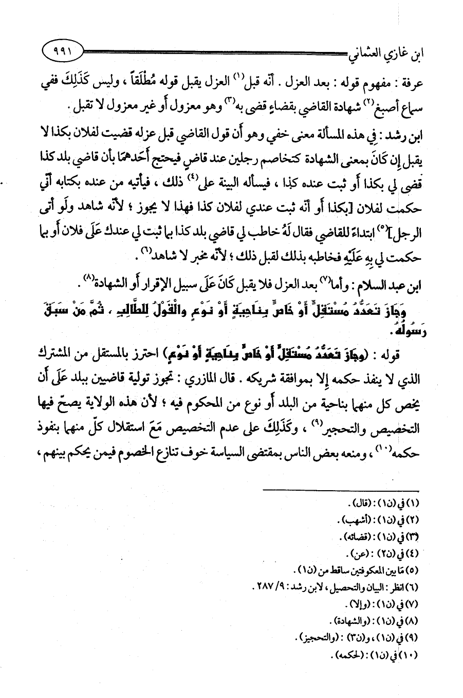 قوله: (وجَازَ تَعَدُّدُ مُسْتَقِلٍّ أَوْ خَاصٍّ بِنَاحِيَةٍ أَوْ نَوْعٍ) احترز بالمستقل من المشترك الذي لا ينفذ حكمه إِلا بموافقة شريكه. قال المازري: تجوز تولية قاضيين ببلد عَلَى أَن يخص كل منهما بناحية من البلد أَو نوع من المحكوم فيه؛ لأن هذه الولاية يصحّ فيها التخصيص والتحجير (¬9)، وكَذَلِكَ على عدم التخصيص مَعَ استقلال كلّ منهما بنفوذ حكمه (¬10)، ومنعه بعض الناس بمقتضى السياسة خوف تنازع الخصوم فيمن يحكم بينهم،