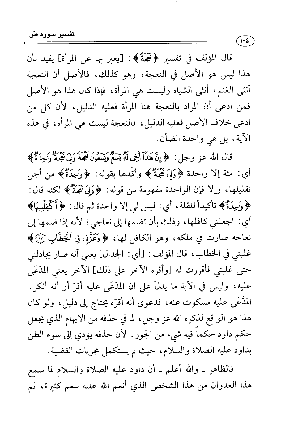 قال الله عز وجل: {إِنَّ هَذَا أَخِي لَهُ تِسْعٌ وَتِسْعُونَ نَعْجَةً وَلِيَ نَعْجَةٌ وَاحِدَةٌ} أي: مئة إلا واحدة {وَلِيَ نَعْجَةٌ} وأكّدها بقوله: {وَاحِدَةٌ} من أجل تقليلها، وإلا فإن الواحدة مفهومة من قوله: {وَلِيَ نَعْجَةٌ} لكنه قال: {وَاحِدَةٌ} تأكيداً للقلة، أي: ليس لي إلا واحدة شم قال: {أَكْفِلْنِيهَا} أي: اجعلني كافلها، وذلك بأن تضمها إلى نعاجي؛ لأنه إذا ضمها إلى نعاجه صارت في ملكه، وهو الكافل لها، {وَعَزَّنِي فِي الْخِطَابِ} غلبني في الخطاب، قال المؤلف: [أي: الجدال] يعني أنه صار يجادلني حتى غلبني فأقررت له [وأقره الآخر على ذلك] الآخر يعني المدّعَى عليه، وليس في الآية ما يدلّ على أن المدّعَى عليه أقرّ أو أنه أنكر. المدَّعَى عليه مسكوت عنه، فدعوى أنه أقرّه يحتاج إلى دليل، ولو كان هذا هو الواقع لذكره الله عز وجل، لما في حذفه من الإيهام الذي يجعل حكم داود حكماً فيه شيء من الجور. لأن حذفه يؤدي إلى سوء الظن بداود عليه الصلاة والسلام، حيث لم يستكمل مجريات القضية.