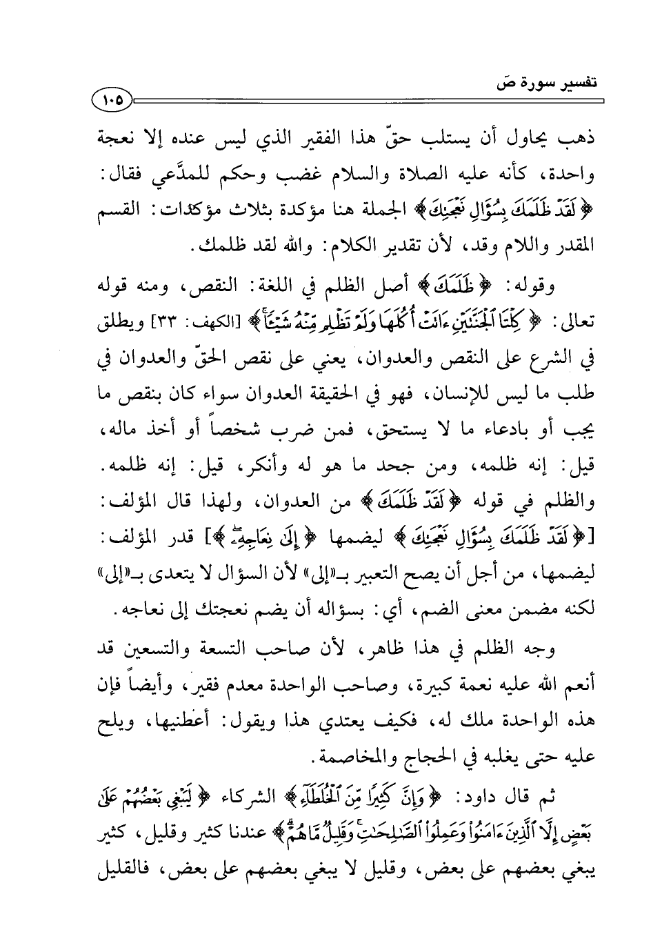 وقوله: {ظَلَمَكَ} أصل الظلم في اللغة: النقص، ومنه قوله تعالى: {كِلْتَا الْجَنَّتَيْنِ آتَتْ أُكُلَهَا وَلَمْ تَظْلِمْ مِنْهُ شَيْئًا (٣٣)} [الكهف: ٣٣] ويطلق في الشرع على النقص والعدوان، يعني على نقص الحقّ والعدوان في طلب ما ليس للإنسان، فهو في الحقيقة العدوان سواء كان بنقص ما يجب أو بادعاء ما لا يستحق، فمن ضرب شخصاً أو أخذ ماله، قيل: إنه ظلمه، ومن جحد ما هو له وأنكر، قيل: إنه ظلمه. والظلم في قوله {لَقَدْ ظَلَمَكَ} من العدوان، ولهذا قال المؤلف: [{لَقَدْ ظَلَمَكَ بِسُؤَالِ نَعْجَتِكَ} ليضمها {إِلَى نِعَاجِهِ}] قدر المؤلف: ليضمها، من أجل أن يصح التعبير بـ "إلى" لأن السؤال لا يتعدى بـ "إلى" لكنه مضمن معنى الضم، أي: بسؤاله أن يضم نعجتك إلى نعاجه.