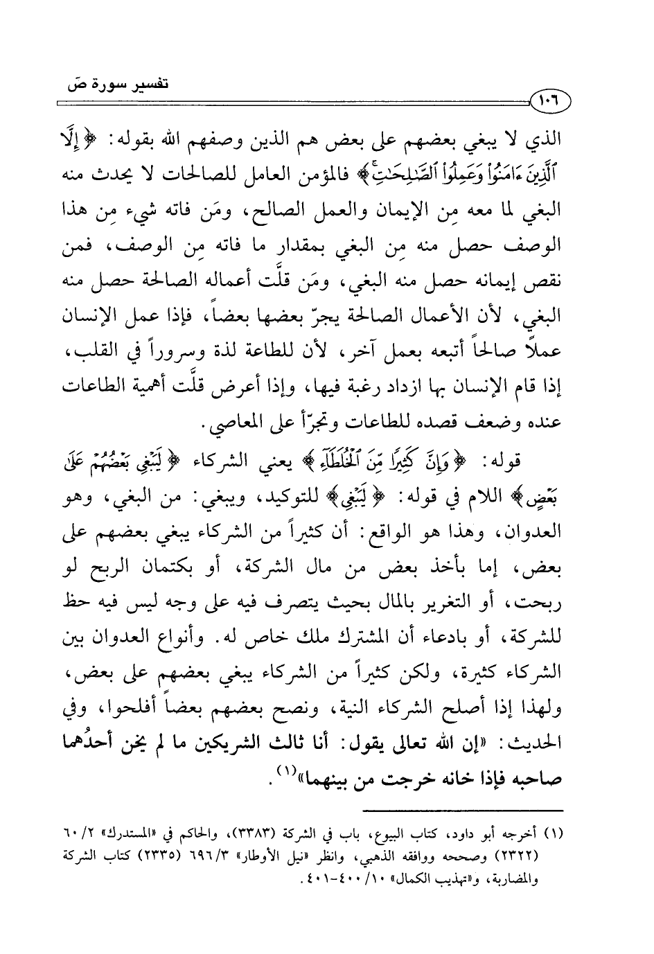 قوله: {وَإِنَّ كَثِيرًا مِنَ الْخُلَطَاءِ} يعني الشركاء {لَيَبْغِي بَعْضُهُمْ عَلَى بَعْضٍ} اللام في قوله: {لَيَبْغِي} للتوكيد، ويبغي: من البغي، وهو العدوان، وهذا هو الواقع: أن كثيراً من الشركاء يبغي بعضهم على بعض، إما بأخذ بعض من مال الشركة، أو بكتمان الربح لو ربحت، أو التغرير بالمال بحيث يتصرف فيه على وجه ليس فيه حظ للشركة، أو بادعاء أن المشترك ملك خاص له. وأنواع العدوان بين الشركاء كثيرة، ولكن كثيراً من الشركاء يبغي بعضهم على بعض، ولهذا إذا أصلح الشركاء النية، ونصح بعضهم بعضاً أفلحوا، وفي الحديث: "إن الله تعالى يقول: أنا ثالث الشريكين ما لم يخن أحدُهما صاحبه فإذا خانه خرجت من بينهما" (¬١).
