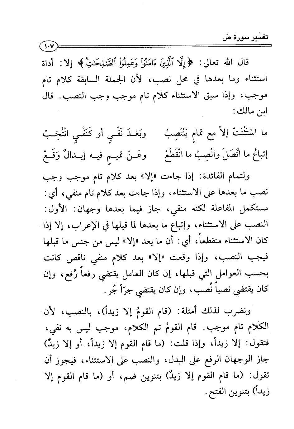 قال الله تعالى: {إِلَّا الَّذِينَ آمَنُوا وَعَمِلُوا الصَّالِحَاتِ} إلا: أداة استثناء وما بعدها في محل نصب، لأن الجملة السابقة كلام تام موجب، وإذا سبق الاستثناء كلام تام موجب وجب النصب. قال ابن مالك: