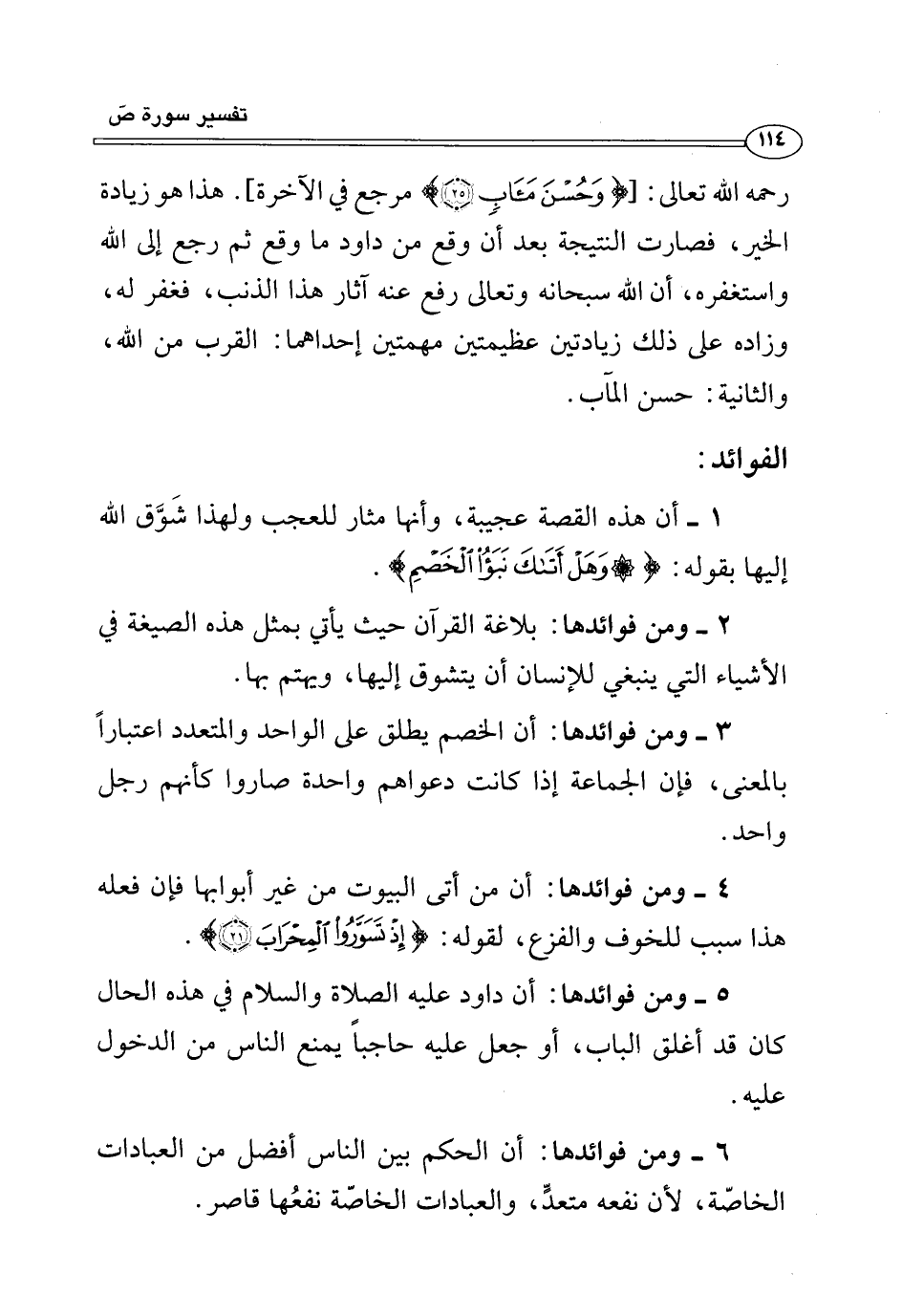 رحمه الله تعالى: [{وَحُسْنَ مَآبٍ (٢٥)} مرجع في الآخرة]. هذا هو زيادة الخير، فصارت النتيجة بعد أن وقع من داود ما وقع ثم رجع إلى الله واستغفره، أن الله سبحانه وتعالى رفع عنه آثار هذا الذنب، فغفر له، وزاده على ذلك زيادتين عظيمتين مهمتين إحداهما: القرب من الله، والثانية: حسن المآب.