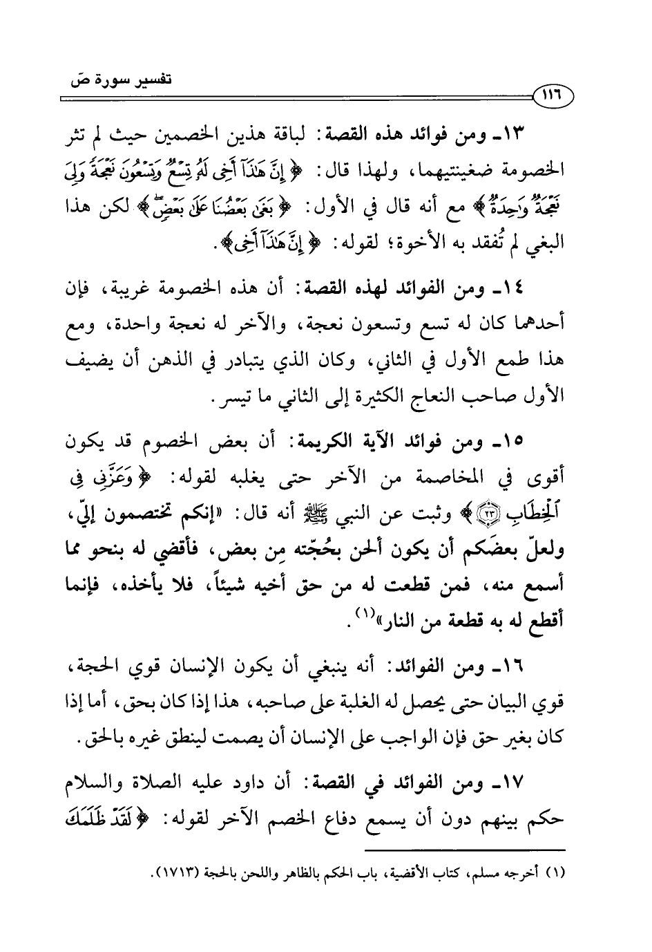 ١٣ - ومن فوائد هذه القصة: لباقة هذين الخصمين حيث لم تثر الخصومة ضغينتيهما، ولهذا قال: {إِنَّ هَذَا أَخِي لَهُ تِسْعٌ وَتِسْعُونَ نَعْجَةً وَلِيَ نَعْجَةٌ وَاحِدَةٌ} مع أنه قال في الأول: {بَغَى بَعْضُنَا عَلَى بَعْضٍ} لكن هذا البغي لم تُفقد به الأخوة؛ لقوله: {إِنَّ هَذَا أَخِي}.