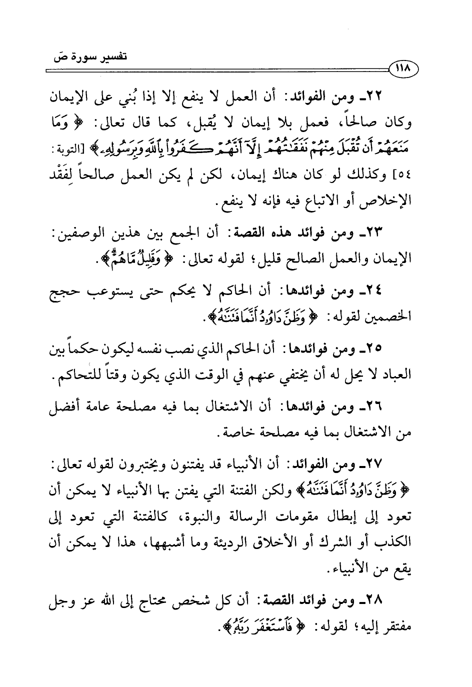 ٢٧ - ومن الفوائد: أن الأنبياء قد يفتنون ويختبرون لقوله تعالى: {وَظَنَّ دَاوُودُ أَنَّمَا فَتَنَّاهُ} ولكن الفتنة التي يفتن بها الأنبياء لا يمكن أن تعود إلى إبطال مقومات الرسالة والنبوة، كالفتنة التي تعود إلى الكذب أو الشرك أو الأخلاق الرديئة وما أشبهها، هذا لا يمكن أن يقع من الأنبياء.