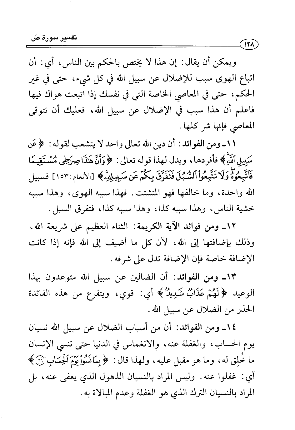 ١١ - ومن الفوائد: أن دين الله تعالى واحد لا يتشعب لقوله: {عَنْ سَبِيلِ اللَّهِ} فأفردها، ويدل لهذا قوله تعالى: {وَأَنَّ هَذَا صِرَاطِي مُسْتَقِيمًا فَاتَّبِعُوهُ وَلَا تَتَّبِعُوا السُّبُلَ فَتَفَرَّقَ بِكُمْ عَنْ سَبِيلِهِ} [الأنعام: ١٥٣]، فسبيل الله واحدة، وما خالفها فهو المتشتت. فهذا سببه الهوى، وهذا سببه خشية الناس، وهذا سببه كذا، وهذا سببه كذا، فتفرق السبل.