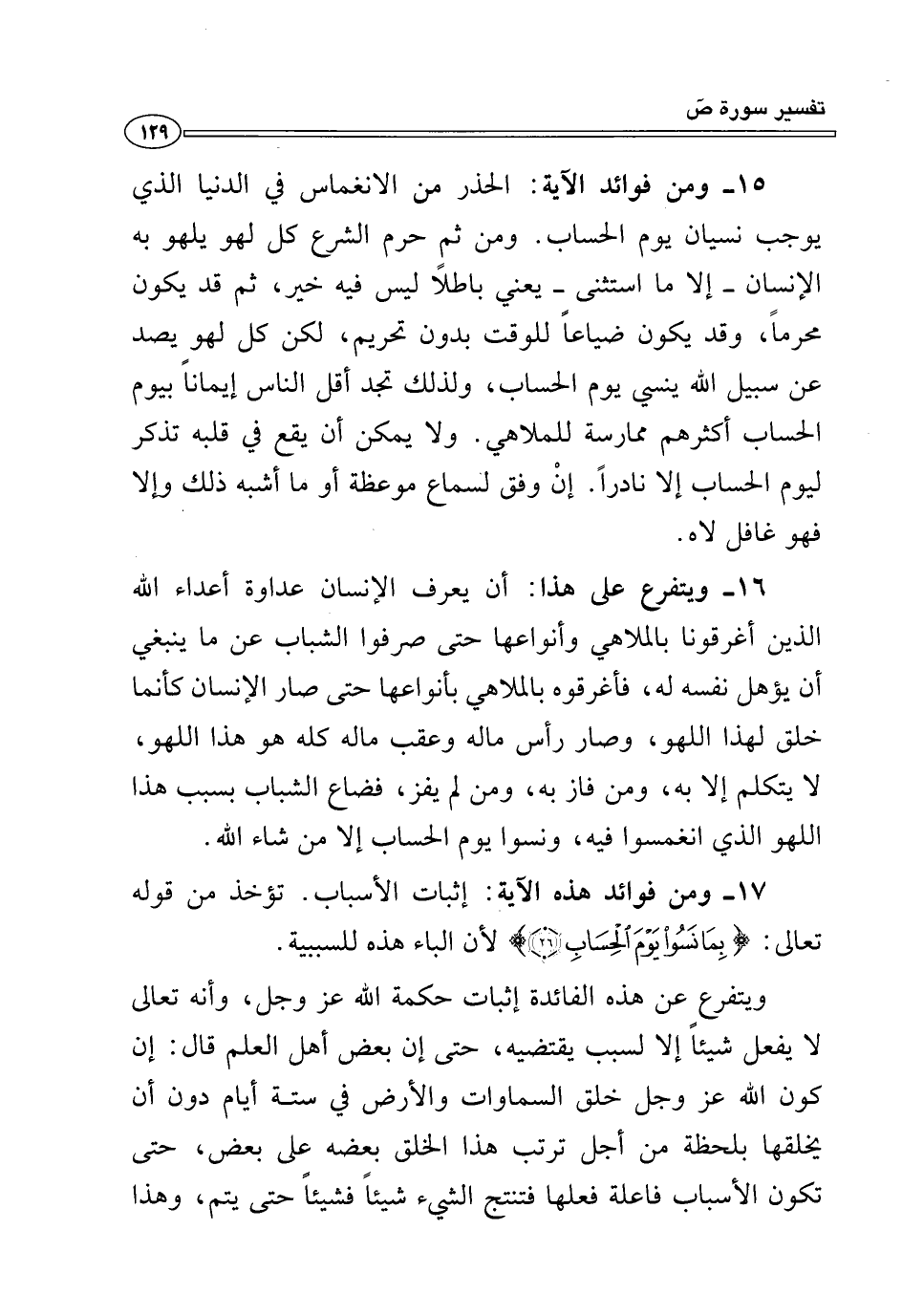 ١٥ - ومن فوائد الآية: الحذر من الانغماس في الدنيا الذي يوجب نسيان يوم الحساب. ومن ثم حرم الشرع كل لهو يلهو به الإنسان - إلا ما استثنى- يعني باطلاً ليس فيه خير، ثم قد يكون محرماً، وقد يكون ضياعاً للوقت بدون تحريم، لكن كل لهو يصد عن سبيل الله ينسي يوم الحساب، ولذلك تجد أقل الناس إيماناً بيوم الحساب أكثرهم ممارسة للملاهي. ولا يمكن أن يقع في قلبه تذكر ليوم الحساب إلا نادراً. إنْ وفق لسماع موعظة أو ما أشبه ذلك وإلا فهو غافل لاه.