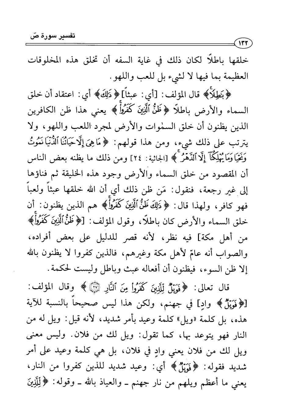 {بَاطِلًا} هو قال المؤلف: [أي: عبثاً] {ذَلِكَ} أي: اعتقاد أن خلق السماء والأرض باطلاً {ظَنُّ الَّذِينَ كَفَرُوا} يعني هذا ظن الكافرين الذين يظنون أن خلق السموات والأرض لمجرد اللعب واللهو، ولا يترتب على ذلك شيء، ومن هذا قولهم: {مَا هِيَ إِلَّا حَيَاتُنَا الدُّنْيَا نَمُوتُ وَنَحْيَا وَمَا يُهْلِكُنَا إِلَّا الدَّهْرُ} [الجاثية: ٢٤]، ومن ذلك ما يظنه بعض الناس أن المقصود من خلق السماء والأرض وجود هذه الخليقة ثم فناؤها إلى غير رجعة، فنقول: مَن ظن ذلك أي أن الله خلقها عبثاً ولعباً فهو كافر، ولهذا قال: {ظَنُّ الَّذِينَ كَفَرُوا} هم الذين يظنون: أن خلق السماء والأرض كان باطلًا، وقول المؤلف: [{ظَنُّ الَّذِينَ كَفَرُوا} من أهل مكة] فيه نظر، لأنه قصر للدليل على بعض أفراده، والصواب أنه عامّ لأهل مكة وغيرهم، فالذين كفروا لا يظنون بالله إلا ظن السوء، فيظنون أن أفعاله عبث وباطل وليست لحكمة.