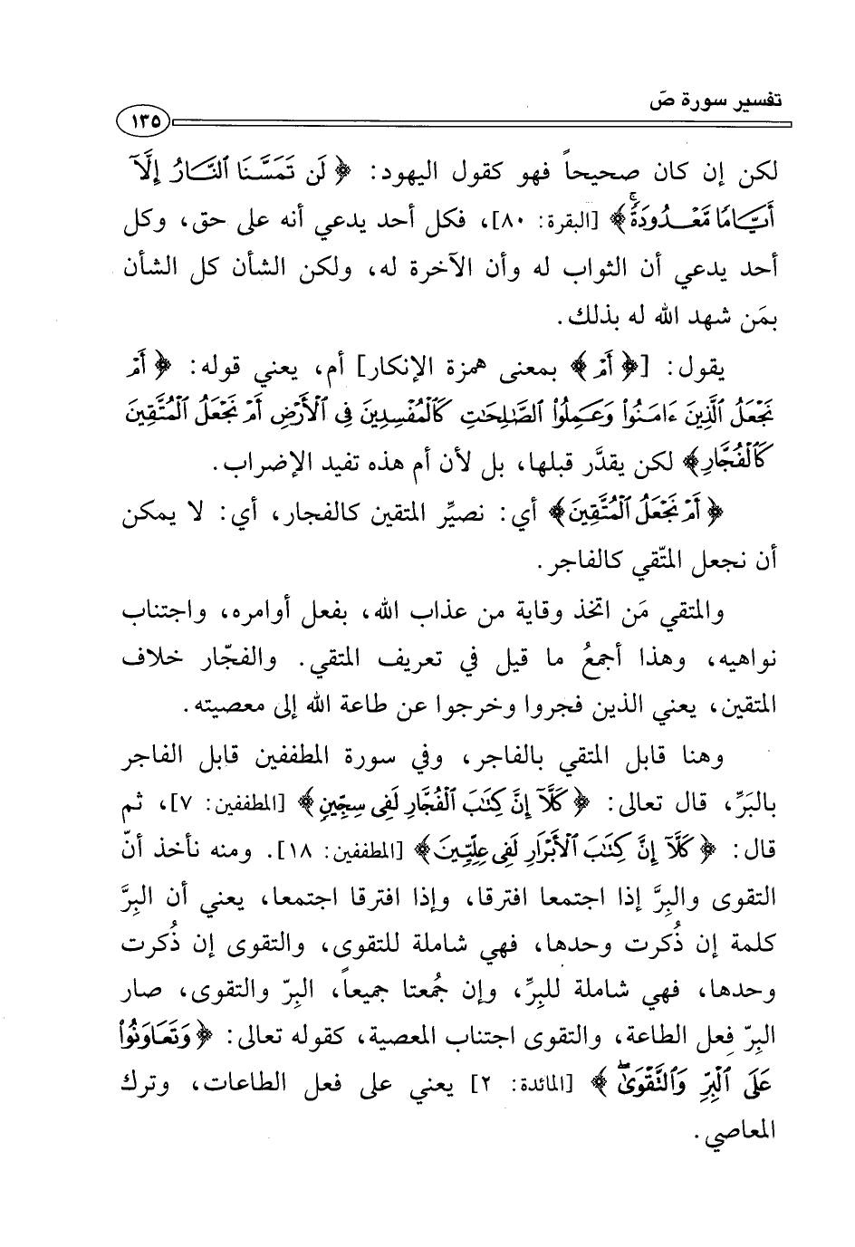 وهنا قابل المتقي بالفاجر، وفي سورة المطففين قابل الفاجر بالبَرِّ، قال تعالى: {كَلَّا إِنَّ كِتَابَ الْفُجَّارِ لَفِي سِجِّينٍ (٧)} [المطففين: ٧]، ثم قال: {كَلَّا إِنَّ كِتَابَ الْأَبْرَارِ لَفِي عِلِّيِّينَ (١٨)} [المطففين: ١٨]. ومنه نأخذ أنّ التقوى والبِرَّ إذا اجتمعا افترقا، وإذا افترقا اجتمعا، يعني أن البِرَّ كلمة إن ذُكرت وحدها، فهي شاملة للتقوى، والتقوى إن ذُكرت وحدها، فهي شاملة "للبِرِّ، وإن جُمعتا جميعاً، البِرّ والتقوى، صار البِرّ فِعل الطاعة، والتقوى اجتناب المعصية، كقوله تعالى: {وَتَعَاوَنُوا عَلَى الْبِرِّ وَالتَّقْوَى} [المائدة: ٢] يعني على فعل الطاعات، وترك المعاصي.