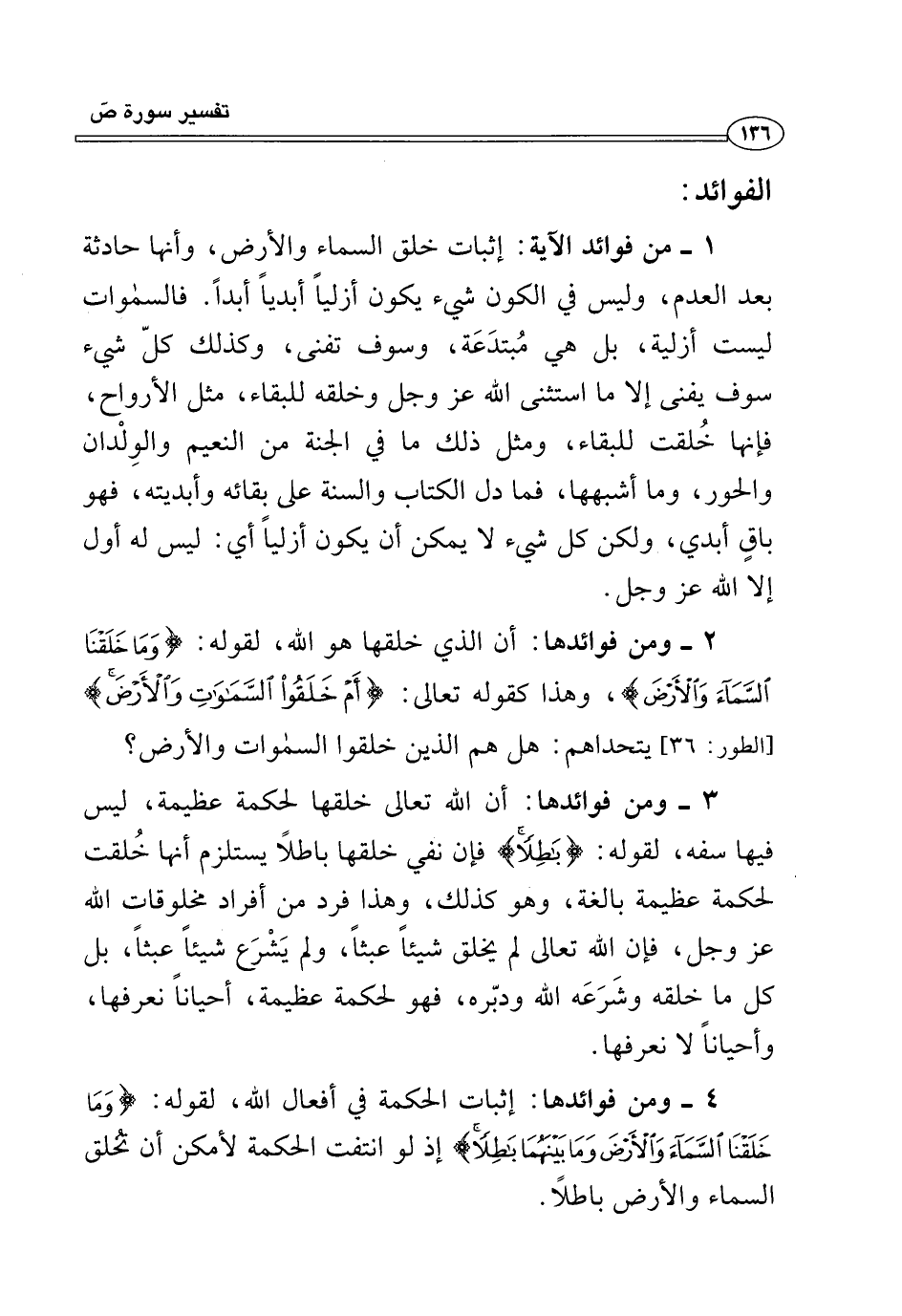 ٤ - ومن فوائدها: إثبات الحكمة في أفعال الله، لقوله: {وَمَا خَلَقْنَا السَّمَاءَ وَالْأَرْضَ وَمَا بَيْنَهُمَا بَاطِلًا} إذ لو انتفت الحكمة لأمكن أن تُخلق السماء والأرض باطلًا.