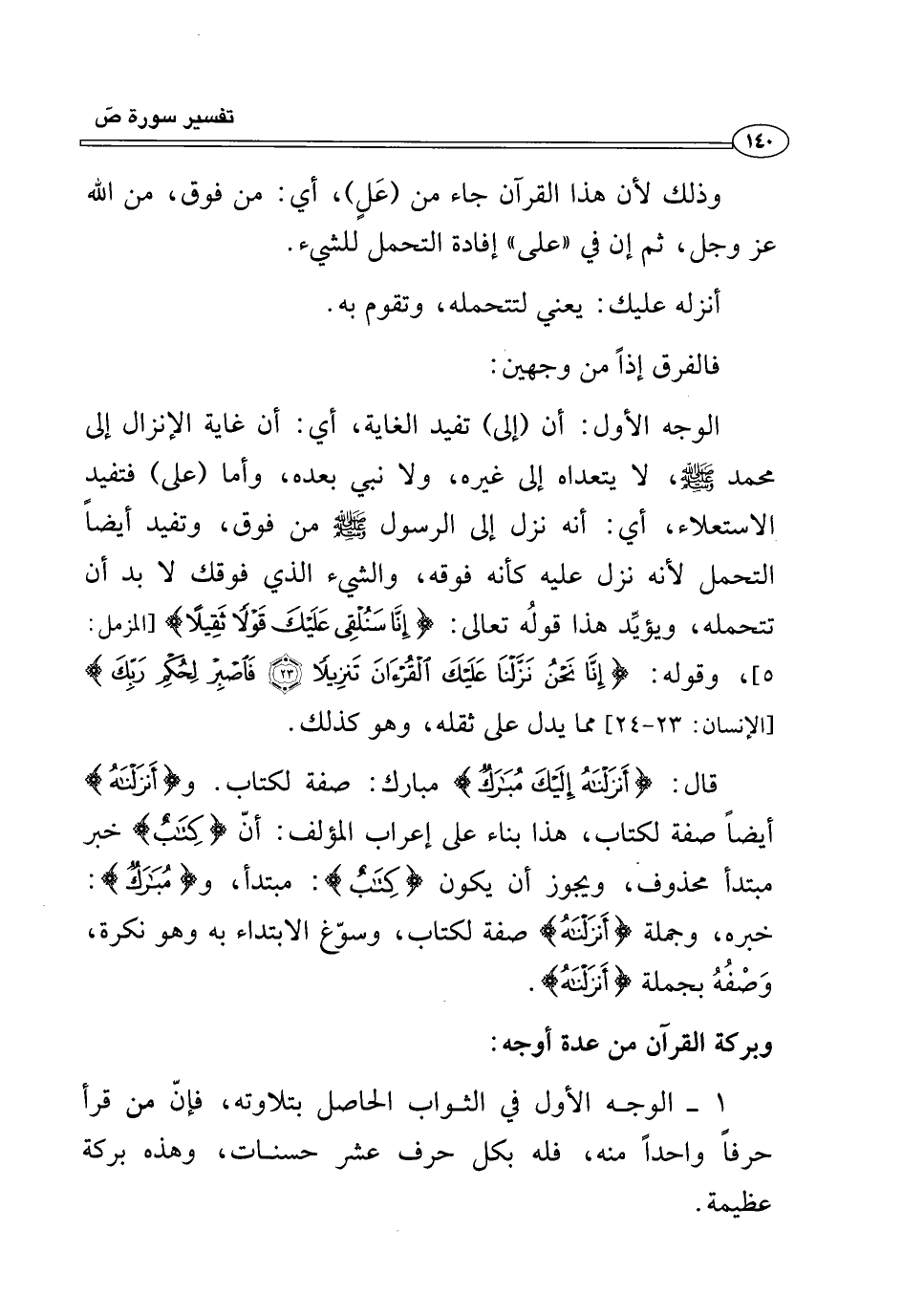 قال: {أَنْزَلْنَاهُ إِلَيْكَ مُبَارَكٌ} مبارك: صفة لكتاب. و {أَنْزَلْنَاهُ} أيضاً صفة لكتاب، هذا بناء على إعراب المؤلف: أنّ {كِتَابٌ} خبر مبتدأ محذوف، ويجوز أن يكون {كِتَابٌ}: مبتدأ، و {مُبَارَكٌ}: خبره، وجملة {أَنْزَلْنَاهُ} صفة لكتاب، وسوّغ الابتداء به وهو نكرة، وَصْفُهُ بجملة {أَنْزَلْنَاهُ}.