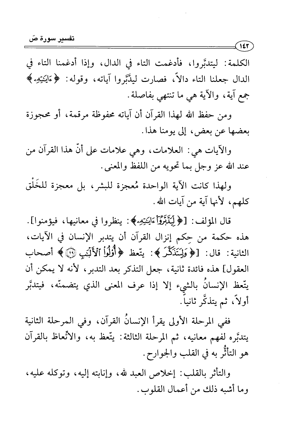 قال المؤلف: [{لِيَدَّبَّرُوا آيَاتِهِ}: ينظروا في معانيها، فيؤمنوا]. هذه حكمة من حِكم إنزال القرآن أن يتدبر الإنسان في الآيات، الثانية: قال: [{وَلِيَتَذَكَّرَ}: يتّعظ {أُولُو الْأَلْبَابِ (٢٩)} أصحاب العقول] هذه فائدة ثانية، جعل التذكر بعد التدبر، لأنه لا يمكن أن يتّعظ الإنسانُ بالشيء إلا إذا عرف المعنى الذي يتضمنّه، فيتدبَّر أولاً، ثم يتذكَّر ثانياً.