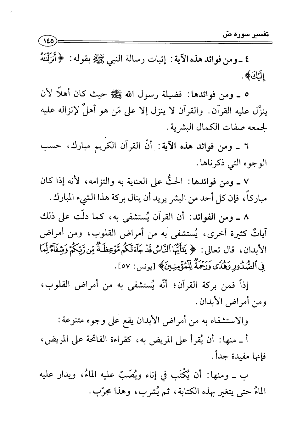 ٨ - ومن الفوائد: أن القرآن يُستشفى به، كما دلّت على ذلك آياتٌ كثيرة أخرى، يُستشفى به من أمراض القلوب، ومن أمراض الأبدان، قال تعالى: {يَاأَيُّهَا النَّاسُ قَدْ جَاءَتْكُمْ مَوْعِظَةٌ مِنْ رَبِّكُمْ وَشِفَاءٌ لِمَا فِي الصُّدُورِ وَهُدًى وَرَحْمَةٌ لِلْمُؤْمِنِينَ (٥٧)} [يونس: ٥٧].