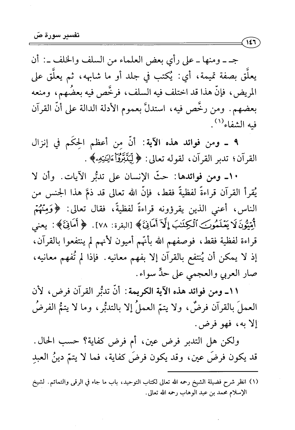 ١٠ - ومن فوائدها: حثّ الإنسان على تدبُّر الآيات. وأن لا يُقرأ القرآن قراءةً لفظيةً فقط، فإنّ الله تعالى قد ذمَّ هذا الجنس من الناس، أعني الذين يقرؤونه قراءةً لفظيةً، فقال تعالى: {وَمِنْهُمْ أُمِّيُّونَ لَا يَعْلَمُونَ الْكِتَابَ إِلَّا أَمَانِيَّ} [البقرة: ٧٨]. {أَمَانِيَّ}: يعني قراءة لفظية فقط، فوصفهم الله بأنهّم أميون لأنهم لم ينتفعوا بالقرآن، إذ لا يمكن أن يُنتفع بالقرآن إلا بفهم معانيه. فإذا لم تُفهم معانيه، صار العربي والعجمي على حدٍّ سواء.