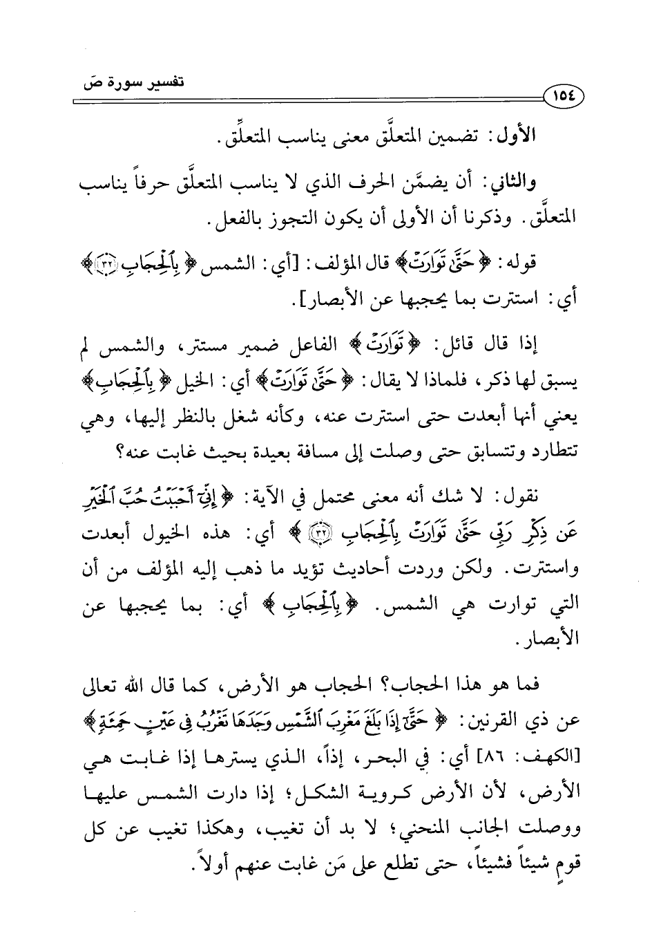 نقول: لا شك أنَّه معنى محتمل في الآية: {إِنِّي أَحْبَبْتُ حُبَّ الْخَيْرِ عَنْ ذِكْرِ رَبِّي حَتَّى تَوَارَتْ بِالْحِجَابِ (٣٢)} أي: هذه الخيول أبعدت واستترت. ولكن وردت أحاديث تؤيد ما ذهب إليه المؤلف من أن التي توارت هي الشَّمس. {بِالْحِجَابِ} أي: بما يحجبها عن الأبصار.