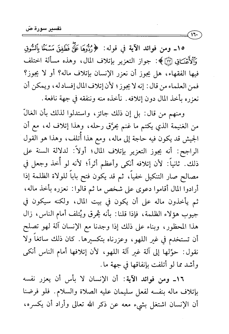 ١٥ - ومن فوائد الآية في قوله: {رُدُّوهَا عَلَيَّ فَطَفِقَ مَسْحًا بِالسُّوقِ وَالْأَعْنَاقِ (٣٣)}: جواز التعزير بإتلاف المال، وهذه مسألة اختلف فيها الفقهاء، هل يجوز أن نعزر الإنسان بإتلاف ماله؟ أو لا يجوز؟ فمن العلماء من قال: إنَّه لا يجوز؛ لأنَّ إتلاف المال إفساد له، ويمكن أن نعزره بأخذ المال دون إتلافه. نأخذه منه وننفقه في جهة نافعة.
