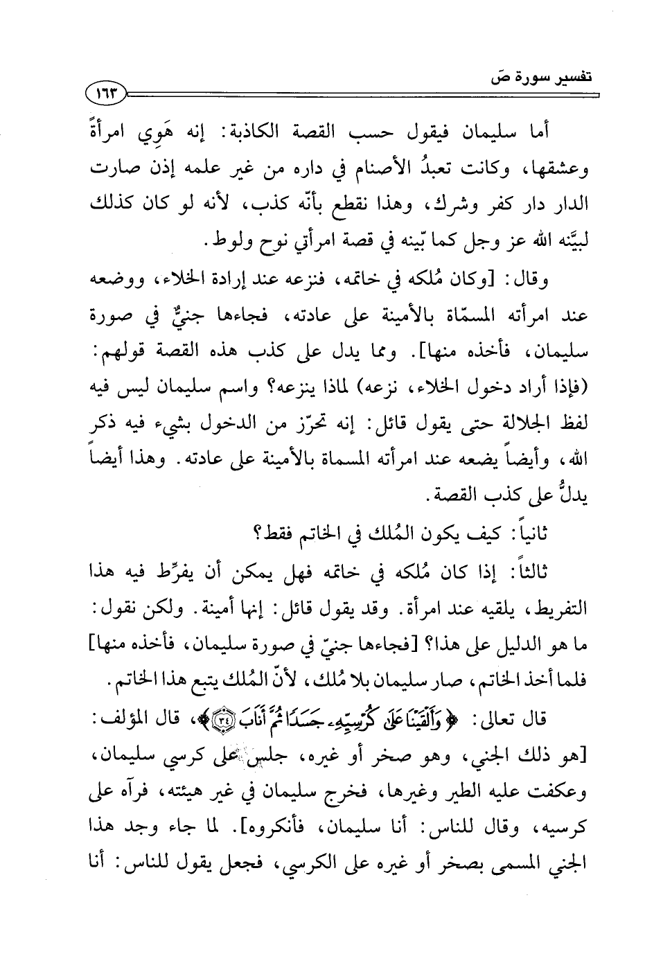 قال تعالى: {وَأَلْقَيْنَا عَلَى كُرْسِيِّهِ جَسَدًا ثُمَّ أَنَابَ (٣٤)}، قال المؤلف: [هو ذلك الجني، وهو صخر أو غيره، جلس علي كرسي سليمان، وعكفت عليه الطير وغيرها، فخرج سليمان في غير هيئته، فرآه على كرسيه، وقال للنَّاس: أنا سليمان، فأنكروه]. لما جاء وجد هذا الجني المسمى بصخر أو غيره على الكرسي، فجعل يقول للنَّاس: أنا