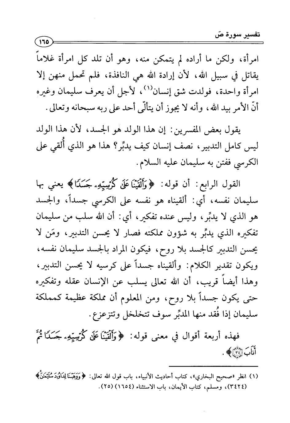 يقول بعض المفسرين: إن هذا الولد هو الجسد، لأنَّ هذا الولد ليس كامل التدبير، نصف إنسان كيف يدبِّر؟ هذا هو الذي أُلقي على الكرسي ففتن به سليمان عليه السَّلام.