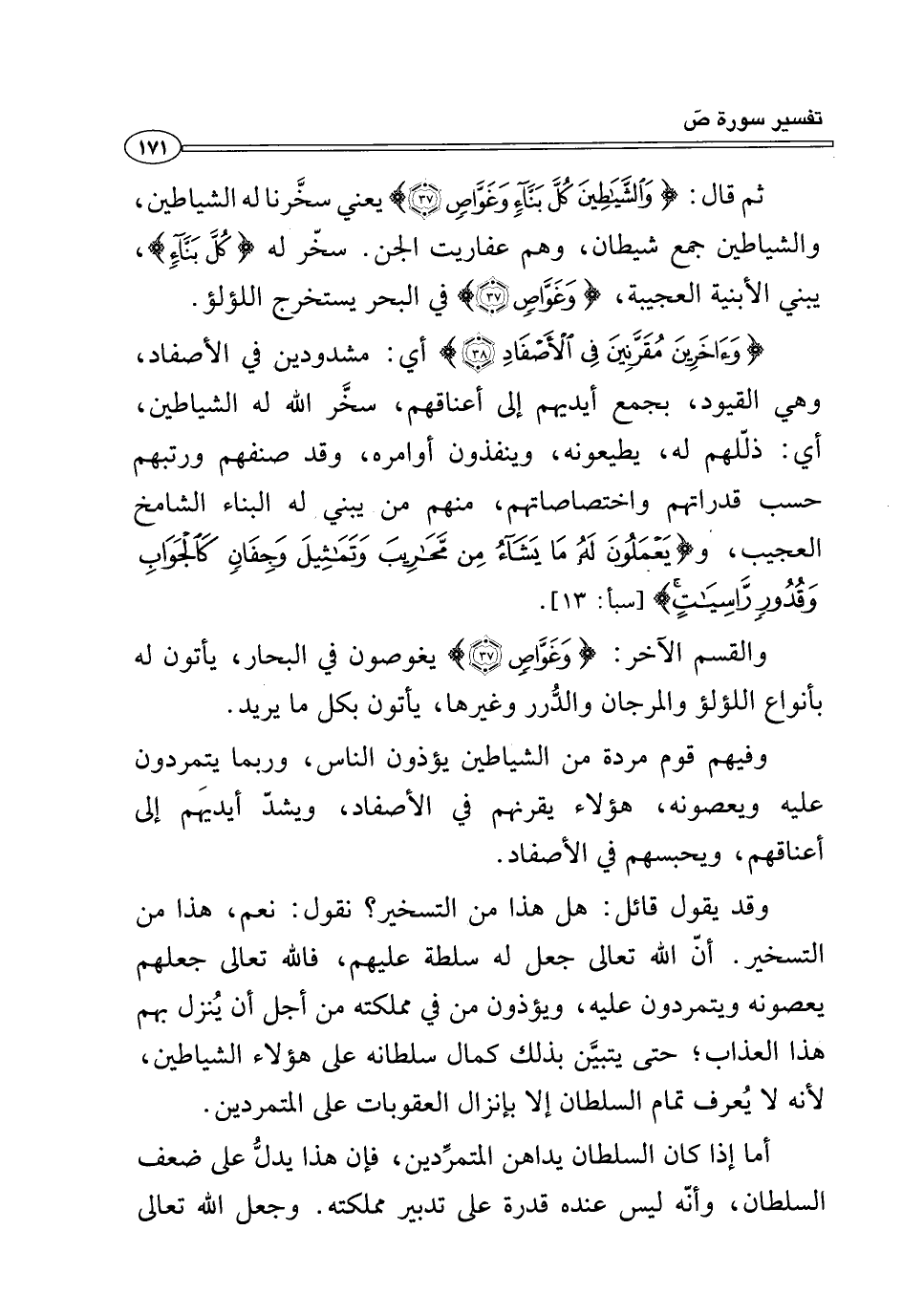 ثم قال: {وَالشَّيَاطِينَ كُلَّ بَنَّاءٍ وَغَوَّاصٍ (٣٧)} يعني سخَّرنا له الشياطين، والشياطين جمع شيطان، وهم عفاريت الجن. سخّر له {كُلَّ بَنَّاءٍ}، يبني الأب نية العجيبة، {وَغَوَّاصٍ (٣٧)} إن في البحر يستخرج اللؤلؤ.