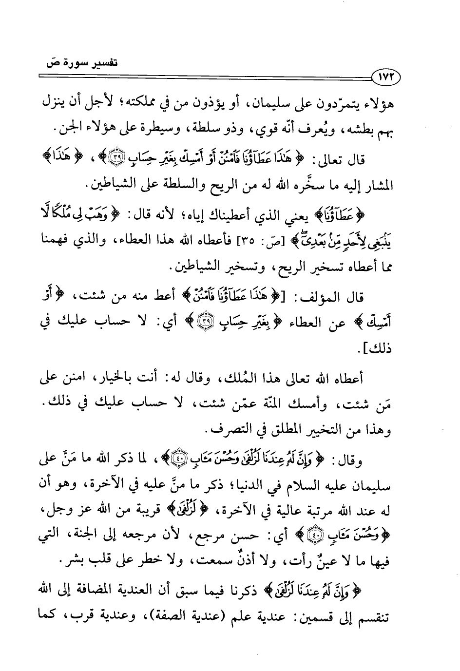 قال المؤلف: [{هَذَا عَطَاؤُنَا فَامْنُنْ} أعط منه من شئت، {أَوْ أَمْسِكْ} عن العطاء {بِغَيْرِ حِسَابٍ (٣٩)} أي: لا حساب عليك في ذلك].
