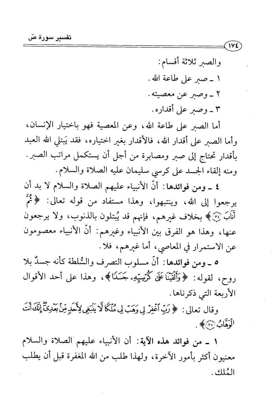 ٤ - ومن فوائدها: أنّ الأنبياء عليهم الصَّلاة والسلام لا بد أن يرجعوا إلى الله، وينتبهوا، وهذا مستفاد من قوله تعالى: {ثُمَّ أَنَابَ (٣٤)} بخلاف غيرهم، فإنهم قد يُبتلون بالذنوب، ولا يرجعون عنها، وهذا هو الفرق بين الأنبياء وغيرهم: أنّ الأنبياء معصومون عن الاستمرار في المعاصي، أما غيرهم، فلا.