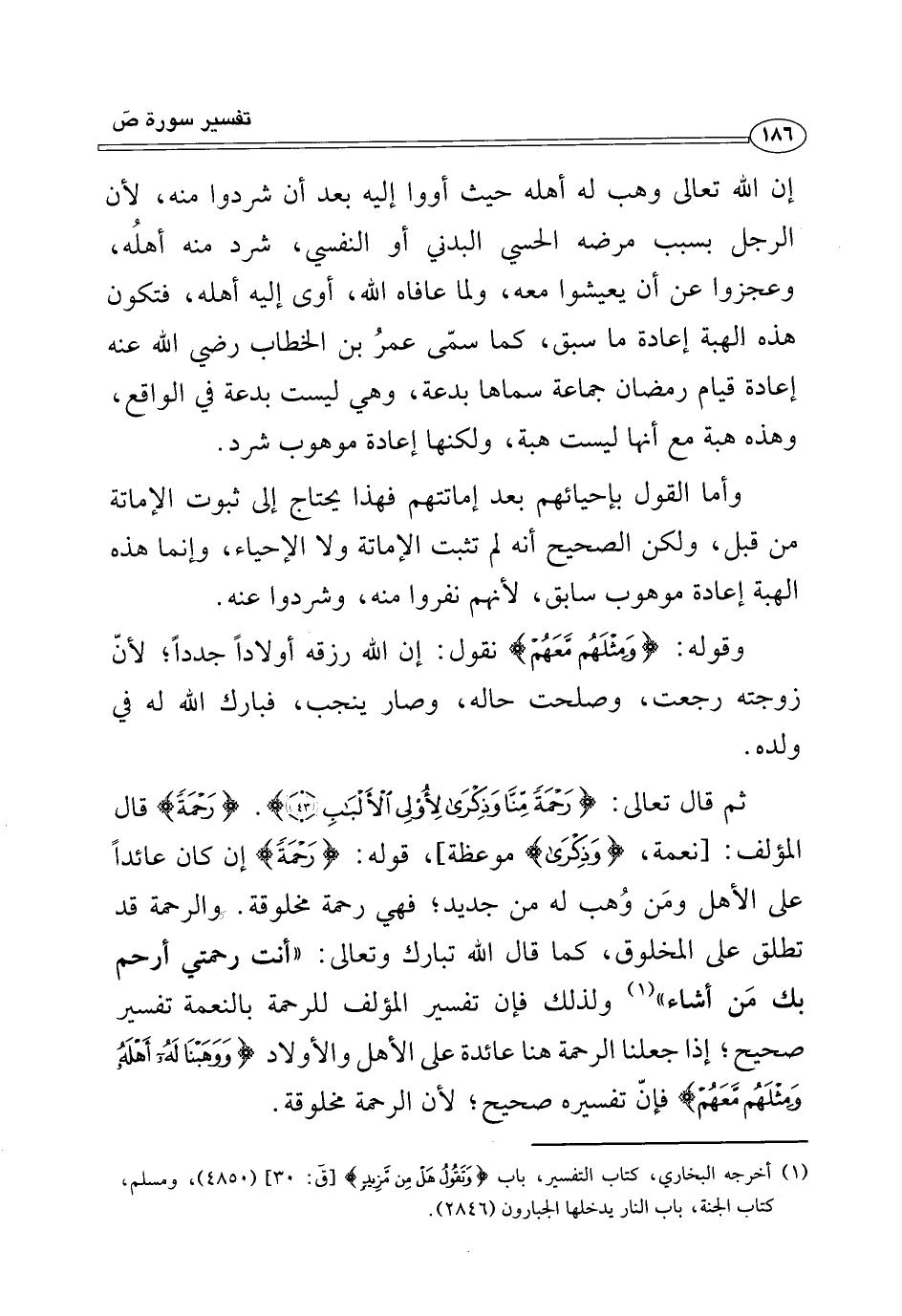 ثم قال تعالى: {رَحْمَةً مِنَّا وَذِكْرَى لِأُولِي الْأَلْبَابِ (٤٣)}. {رَحْمَةً} قال المؤلف: [نعمة، {وَذِكْرَى} موعظة] قوله: {رَحْمَةً} إن كان عائدًا على الأهل ومَن وُهب له من جديد؛ فهي رحمة مخلوقاً، والرحمة قد تطلق على المخلوق، كما قال الله تبارك وتعالى: "أنت رحمتي أرحم بك مَن أشاء" (¬١) ولذلك فإن تفسير المؤلف للرحمة بالنعمة تفسير صحيح؛ إذا جعلنا الرحمة هنا عائدة على الأهل والأولاد {وَوَهَبْنَا لَهُ أَهْلَهُ وَمِثْلَهُمْ مَعَهُمْ} فإنّ تفسيره صحيح؛ لأنَّ الرحمة مخلوقة.