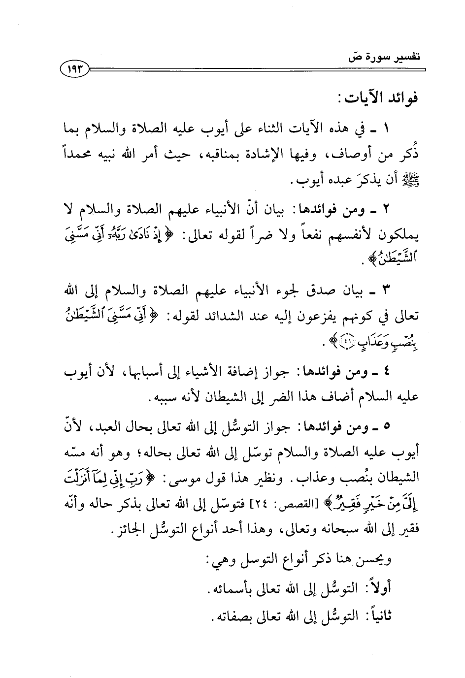 ٥ - ومن فوائدها: جواز التوسُّل إلى الله تعالى بحال العبد، لأنّ أيوب عليه الصَّلاة والسلام توسّل إلى الله تعالى بحاله؛ وهو أنَّه مسّه الشَّيطان بنُصب وعذاب. ونظير هذا قول موسى: {رَبِّ إِنِّي لِمَا أَنْزَلْتَ إِلَيَّ مِنْ خَيْرٍ فَقِيرٌ} [القصص: ٢٤] فتوسّل إلى الله تعالى بذكر حاله وأنّه فقير إلى الله سبحانه وتعالى، وهذا أحد أنواع التوسُّل الجائز.