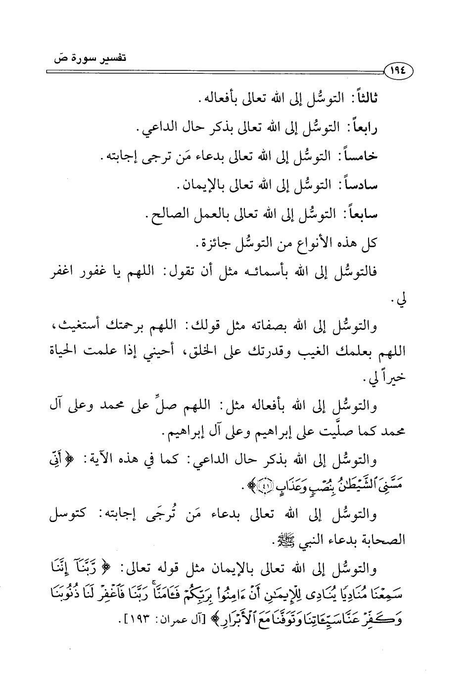 والتوسُّل إلى الله بذكر حال الداعي: كما في هذه الآية: {أَنِّي مَسَّنِيَ الشَّيْطَانُ بِنُصْبٍ وَعَذَابٍ (٤١)}.