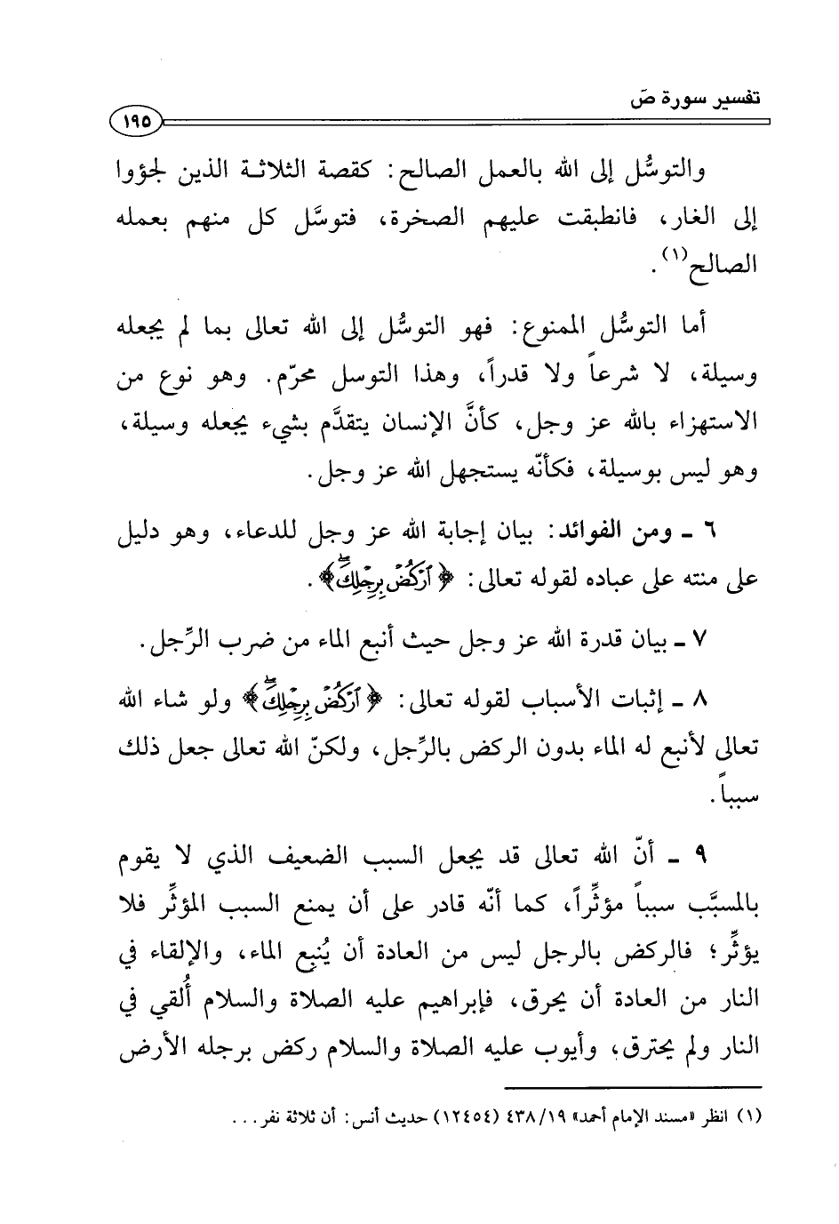 ٩ - أنّ الله تعالى قد يجعل السبب الضعيف الذي لا يقوم بالمسبَّب سببًا مؤثِّراً، كما أنّه قادر على أن يمنع السبب المؤثِّر فلا يؤثِّر؛ فالركض بالرجل ليس من العادة أن يُنبع الماء، والإلقاء في النَّار من العادة أن يحرق، فإبراهيم عليه الصَّلاة والسلام أُلقي في النَّار ولم يحترق، وأيوب عليه الصَّلاة والسلام ركض برجله الأرض