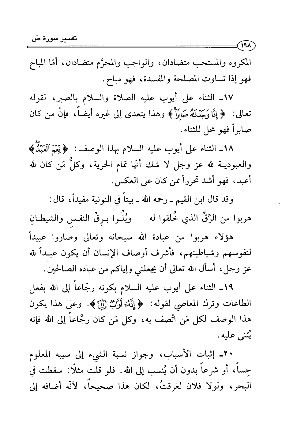 ١٩ - الثّناء على أيوب عليه السَّلام بكونه رجّاعاً إلى الله بفعل الطاعات وترك المعاصي لقوله: {إِنَّهُ أَوَّابٌ (٤٤)}. وعلى هذا يكون هذا الوصف لكل مَن اتّصف به، وكل مَن كان رجَّاعاً إلى الله فإنَّه يُثنى عليه.