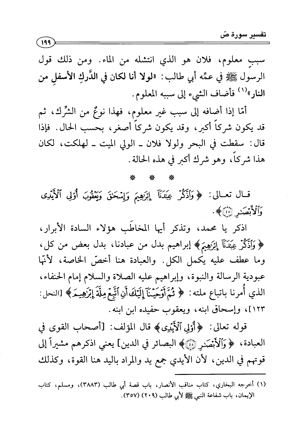 قوله تعالى: {أُولِي الْأَيْدِي} قال المؤلف: [أصحاب القوى في العبادة، {وَالْأَبْصَارِ (٤٥)} البصائر في الدين] يعني اذكرهم مشيراً إلى قوتهم في الدين، لأنَّ الأيدي جمع يد والمراد باليد هنا القوة، وكذلك
