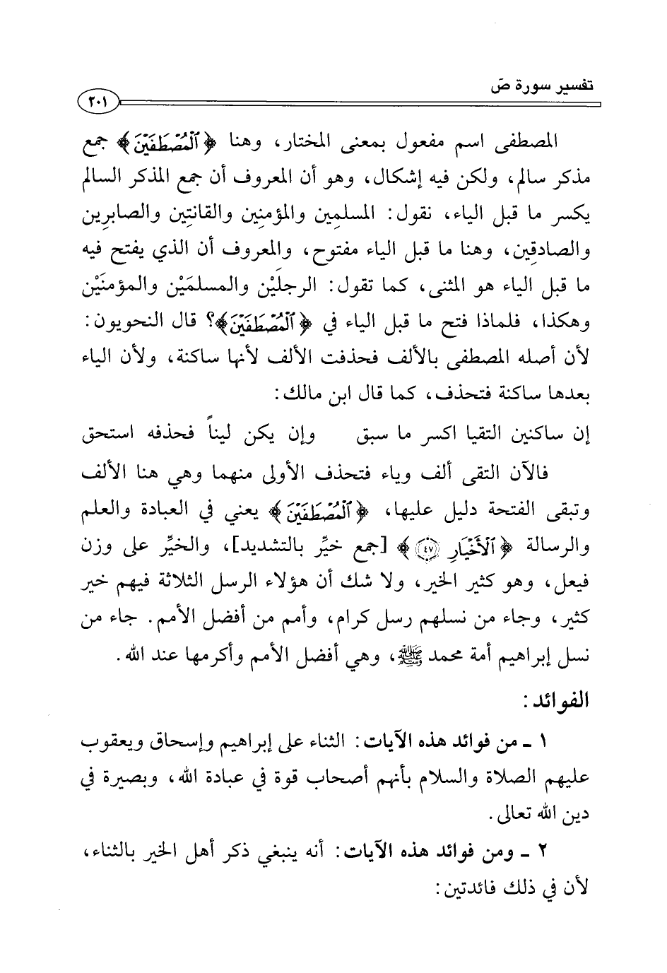 فالآن التقى ألف وياء فتحذف الأولى منهما وهي هنا الألف وتبقى الفتحة دليل عليها، {الْمُصْطَفَيْنَ} يعني في العبادة والعلم والرسالة {الْأَخْيَارِ (٤٧)} [جمع خيِّر بالتشديد]، والخيِّر على وزن فيعل، وهو كثير الخير، ولا شك أن هؤلاء الرسل الثلاثة فيهم خير كثير، وجاء من نسلهم رسل كرام، وأمم من أفضل الأمم. جاء من نسل إبراهيم أمة محمد - صلى الله عليه وسلم -، وهي أفضل الأمم وأكرمها عند الله.