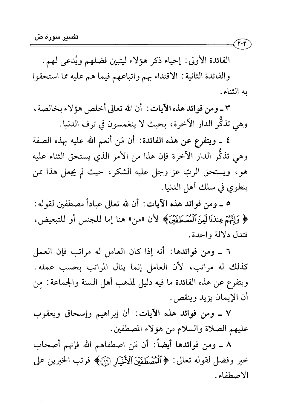 ٨ - ومن فوائدها أيضًا: أن مَن اصطفاهم الله فإنهم أصحاب خير وفضل لقوله تعالى: {الْمُصْطَفَيْنَ الْأَخْيَارِ (٤٧)} فرتب الخيرين على الاصطفاء.