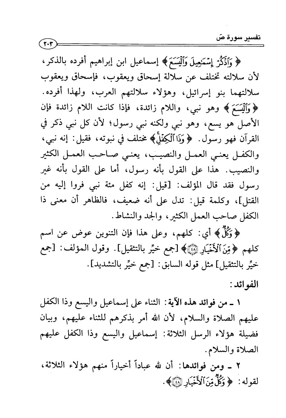{وَاذْكُرْ إِسْمَاعِيلَ وَالْيَسَعَ} إسماعيل ابن إبراهيم أفرده بالذكر، لأن سلالته تختلف عن سلالة إسحاق ويعقوب، فإسحاق ويعقوب سلالتهما بنو إسرائيل، وهؤلاء سلالتهم العرب، ولهذا أفرده. {وَالْيَسَعَ} وهو نبي، واللام زائدة، فإذا كانت اللام زائدة فإن الأصل هو يسع، وهو نبي ولكنه نبي رسول، لأن كل نبي ذكر في القرآن فهو رسول. {وَذَا الْكِفْلِ} مختلف في نبوته، فقيل: إنه نبي، والكفل يعني العمل والنصيب، يعني صاحب العمل الكثير والنصيب، هذا على القول بأنه رسول، أما على القول بأنه غير رسول فقد قال المؤلف: [قيل: إنه كفل مئة نبي فروا إليه من القتل]، وكلمة قيل: تدل على أنه ضعيف، فالظاهر أن معنى ذا الكفل صاحب العمل الكثير، والجد والنشاط.