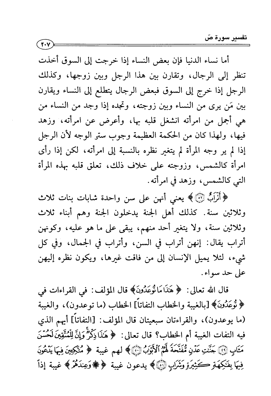 {أَتْرَابٌ (٥٢)} يعني أنهن على سن واحدة شابات بنات ثلاث وثلاثين سنة. كذلك أهل الجنة يدخلون الجنة وهم أبناء ثلاث وثلاثين سنة، ولا يتغير أحد منهم، يبقى على ما هو عليه، وكونهن أتراب يقال: إنهن أتراب في السن، وأتراب في الجمال، وفي كل شيء، لئلا يميل الإنسان إلى من فاقت غيرها، ويكون نظره إليهن على حد سواء.