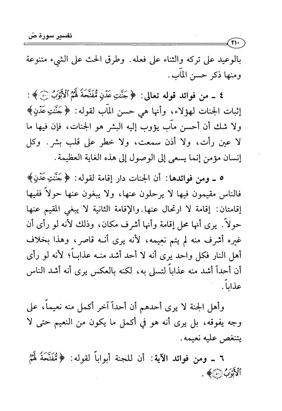 ٤ - من فوائد قوله تعالى: {جَنَّاتِ عَدْنٍ مُفَتَّحَةً لَهُمُ الْأَبْوَابُ (٥٠)}: إثبات الجنات لهؤلاء، وأنها هي حسن المآب لقوله: {جَنَّاتِ عَدْنٍ} ولا شك أن أحسن مآب يؤوب إليه البشر هو الجنات، فإن فيها ما لا عين رأت، ولا أذن سمعت، ولا خطر على قلب بشر. وكل إنسان مؤمن إنما يسعى إلى الوصول إلى هذه الغاية العظيمة.