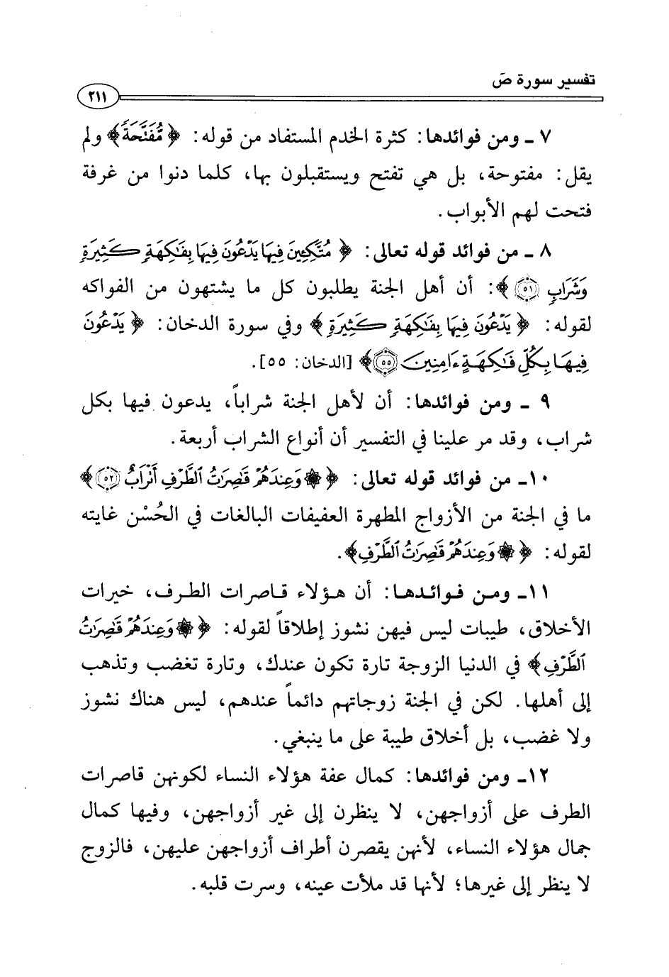 ١١ - ومن فوائدها: أن هؤلاء قاصرات الطرف، خيرات الأخلاق، طيبات ليس فيهن نشوز إطلاقًا لقوله: {وَعِنْدَهُمْ قَاصِرَاتُ الطَّرْفِ} في الدنيا الزوجة تارة تكون عندك، وتارة تغضب وتذهب إلى أهلها. لكن في الجنة زوجاتهم دائمًا عندهم، ليس هناك نشوز ولا غضب، بل أخلاق طيبة على ما ينبغي.