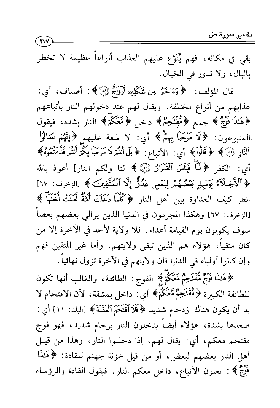 قال المؤلف: {وَآخَرُ مِنْ شَكْلِهِ أَزْوَاجٌ (٥٨)}: أصناف، أي: عذابهم من أنواع مختلفة. ويقال لهم عند دخولهم النار بأتباعهم {هَذَا فَوْجٌ} جمع {مُقْتَحِمٌ} داخل {مَعَكُمْ} النار بشدة، فيقول المتبوعون: {لَا مَرْحَبًا بِهِمْ} أي: لا سَعة عليهم {إِنَّهُمْ صَالُو النَّارِ (٥٩)} {قَالُوا} أي: الأتباع: {بَلْ أَنْتُمْ لَا مَرْحَبًا بِكُمْ أَنْتُمْ قَدَّمْتُمُوهُ} أي: الكفر {لَنَا فَبِئْسَ الْقَرَارُ (٦٠)} لنا ولكم النار] أعوذ بالله {الْأَخِلَّاءُ يَوْمَئِذٍ بَعْضُهُمْ لِبَعْضٍ عَدُوٌّ إِلَّا الْمُتَّقِينَ} [الزخرف: ٦٧] انظر كيف العداوة بين أهل النار {كُلَّمَا دَخَلَتْ أُمَّةٌ لَعَنَتْ أُخْتَهَا} [الأعراف: ٣٨] وهكذا المجرمون في الدنيا الذين يوالي بعضهم بعضًا سوف يكونون يوم القيامة أعداء. فلا ولاية لأحد في الآخرة إلا من كان متقيًا، هؤلاء هم الذين تبقى ولايتهم، وأما غير المتقين فهم فإن كانوا أولياء في الدنيا فإن ولايتهم في الآخرة تزول نهائيًا.