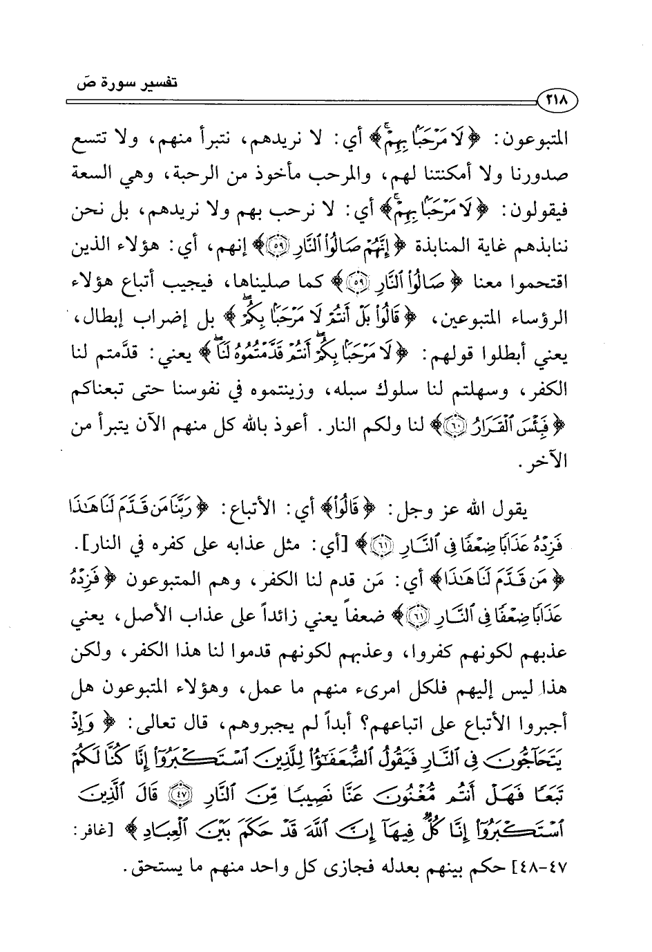 المتبوعون: {لَا مَرْحَبًا بِهِمْ} أي: لا نريدهم، نتبرأ منهم، ولا تتسع صدورنا ولا أمكنتنا لهم، والمرحب مأخوذ من الرحبة، وهي السعة فيقولون: {لَا مَرْحَبًا بِهِمْ} أي: لا نرحب بهم ولا نريدهم، بل نحن ننابذهم غاية المنابذة {إِنَّهُمْ صَالُو النَّارِ (٥٩)} إنهم، أي: هؤلاء الذين اقتحموا معنا {صَالُو النَّارِ (٥٩)} كما صليناها، فيجيب أتباع هؤلاء الرؤساء المتبوعين، {قَالُوا بَلْ أَنْتُمْ لَا مَرْحَبًا بِكُمْ} بل إضراب إبطال، يعني أبطلوا قولهم: {لَا مَرْحَبًا بِكُمْ أَنْتُمْ قَدَّمْتُمُوهُ لَنَا} يعني: قدَّمتم لنا الكفر، وسهلتم لنا سلوك سبله، وزينتموه في نفوسنا حتى تبعناكم {فَبِئْسَ الْقَرَارُ (٦٠)} لنا ولكم النار. أعوذ بالله كل منهم الآن يتبرأ من الآخر.
