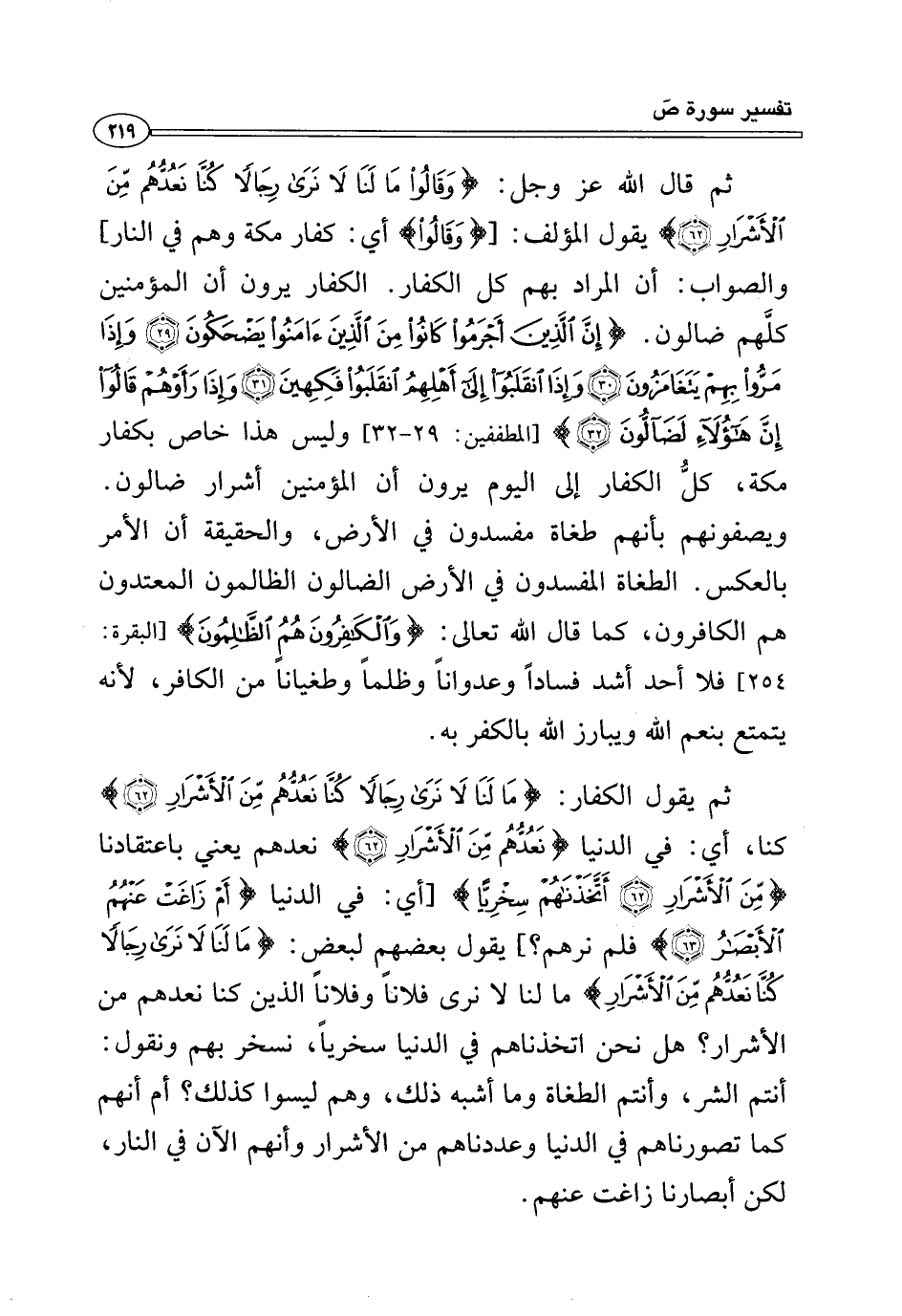 ثم قال الله عز وجل: {وَقَالُوا مَا لَنَا لَا نَرَى رِجَالًا كُنَّا نَعُدُّهُمْ مِنَ الْأَشْرَارِ (٦٢)} يقول المؤلف: {وَقَالُوا} أي: كفار مكة وهم في النار] والصواب: أن المراد بهم كل الكفار. الكفار يرون أن المؤمنين كلَّهم ضالون. {إِنَّ الَّذِينَ أَجْرَمُوا كَانُوا مِنَ الَّذِينَ آمَنُوا يَضْحَكُونَ (٢٩) وَإِذَا مَرُّوا بِهِمْ يَتَغَامَزُونَ (٣٠) وَإِذَا انْقَلَبُوا إِلَى أَهْلِهِمُ انْقَلَبُوا فَكِهِينَ (٣١) وَإِذَا رَأَوْهُمْ قَالُوا إِنَّ هَؤُلَاءِ لَضَالُّونَ (٣٢)} [المطففين: ٢٩ - ٣٢] وليس هذا خاص بكفار مكة، كلُّ الكفار إلى اليوم يرون أن المؤمنين أشرار ضالون. ويصفونهم بأنهم طغاة مفسدون في الأرض، والحقيقة أن الأمر بالعكس. الطغاة المفسدون في الأرض الضالون الظالمون المعتدون هم الكافرون، كما قال الله تعالى: {وَالْكَافِرُونَ هُمُ الظَّالِمُونَ} [البقرة: ٢٥٤] فلا أحد أشد فسادًا وعدوانًا وظلمًا وطغيانًا من الكافر، لأنه يتمتع بنعم الله ويبارز الله بالكفر به.