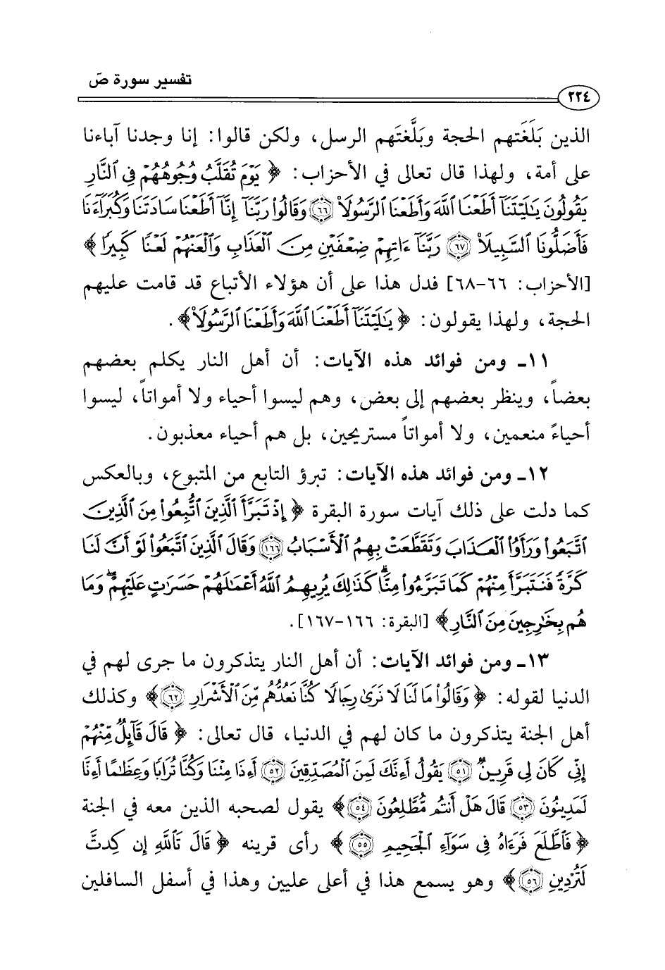 ١٢ - ومن فوائد هذه الآيات: تبرؤ التابع من المتبوع، وبالعكس كما دلت على ذلك آيات سورة البقرة {إِذْ تَبَرَّأَ الَّذِينَ اتُّبِعُوا مِنَ الَّذِينَ اتَّبَعُوا وَرَأَوُا الْعَذَابَ وَتَقَطَّعَتْ بِهِمُ الْأَسْبَابُ (١٦٦) وَقَالَ الَّذِينَ اتَّبَعُوا لَوْ أَنَّ لَنَا كَرَّةً فَنَتَبَرَّأَ مِنْهُمْ كَمَا تَبَرَّءُوا مِنَّا كَذَلِكَ يُرِيهِمُ اللَّهُ أَعْمَالَهُمْ حَسَرَاتٍ عَلَيْهِمْ وَمَا هُمْ بِخَارِجِينَ مِنَ النَّارِ} [البقرة: ١٦٦ - ١٦٧].