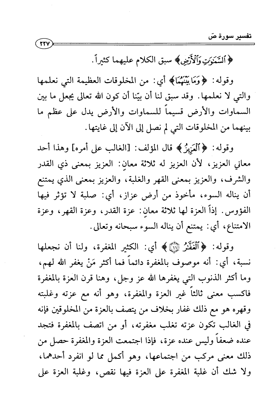 وقوله: {الْعَزِيزُ} قال المؤلف: [الغالب على أمره] وهذا أحد معاني العزيز، لأن العزيز له ثلاثة معانٍ: العزيز بمعنى ذي القدر والشرف، والعزيز بمعنى القهر والغلبة، والعزيز بمعنى الذي يمتنع أن يناله السوء، مأخوذ من أرض عزاز، أي: صلبة لا تؤثر فيها الفؤوس. إذًاا لعزة لها ثلاثة معانٍ: عزة القدر، وعزة القهر، وعزة الامتناع، أي: يمتنع أن يناله السوء سبحانه وتعالى.