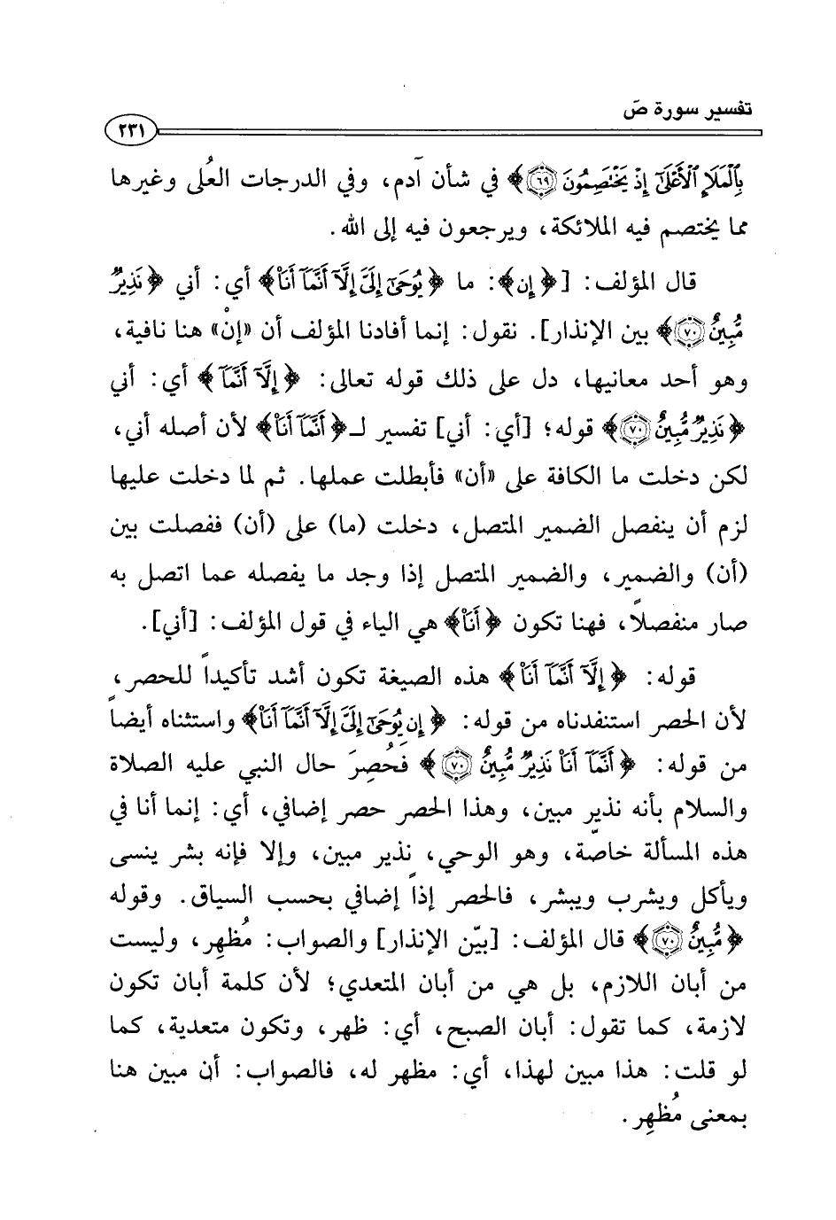 قوله: {إِلَّا أَنَّمَا أَنَا} هذه الصيغة تكون أشد تأكيدًا للحصر، لأن الحصر استنفدناه من قوله: {إِنْ يُوحَى إِلَيَّ إِلَّا أَنَّمَا أَنَا} واستثناه أيضًا من قوله: {أَنَّمَا أَنَا نَذِيرٌ مُبِينٌ (٧٠)} فحُصِرَ حال النبي عليه الصلاة والسلام بأنه نذير مبين، وهذا الحصر حصر إضافي، أي: إنما أنا في هذه المسألة خاصّة، وهو الوحي، نذير مبين، وإلا فإنه بشر ينسى ويأكل ويشرب ويبشر، فالحصر إذًا إضافي بحسب السياق. وقوله {مُبِينٌ (٧٠)} قال المؤلف: [بيّن الإنذار] والصواب: مُظهِر، وليست من أبان اللازم، بل هي من أبان المتعدي؛ لأن كلمة أبان تكون لازمة، كما تقول: أبان الصبح، أي: ظهر، وتكون متعدية، كما لو قلت: هذا مبين لهذا، أي: مظهر له، فالصواب: أن مبين هنا بمعنى مُظهِر.