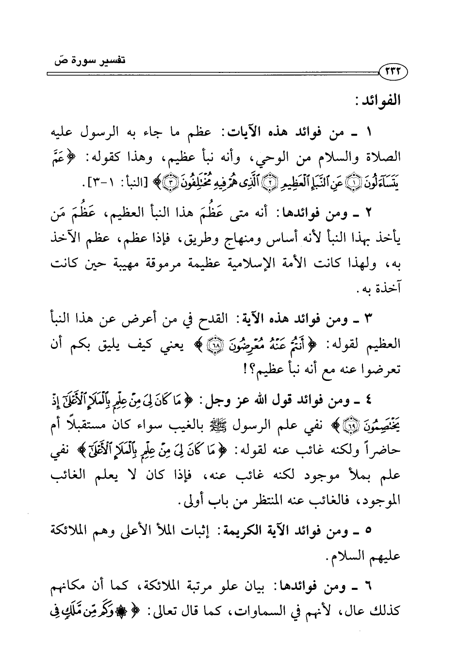 ٤ - ومن فوائد قول الله عز وجل: {مَا كَانَ لِيَ مِنْ عِلْمٍ بِالْمَلَإِ الْأَعْلَى إِذْ يَخْتَصِمُونَ (٦٩)} نفي علم الرسول - صلى الله عليه وسلم - بالغيب سواء كان مستقبلًا أم حاضرًا ولكنه غائب عنه لقوله: {مَا كَانَ لِيَ مِنْ عِلْمٍ بِالْمَلَإِ الْأَعْلَى} نفي علم بملأ موجود لكنه غائب عنه، فإذا كان لا يعلم الغائب الموجود، فالغائب عنه المنتظر من باب أولى.